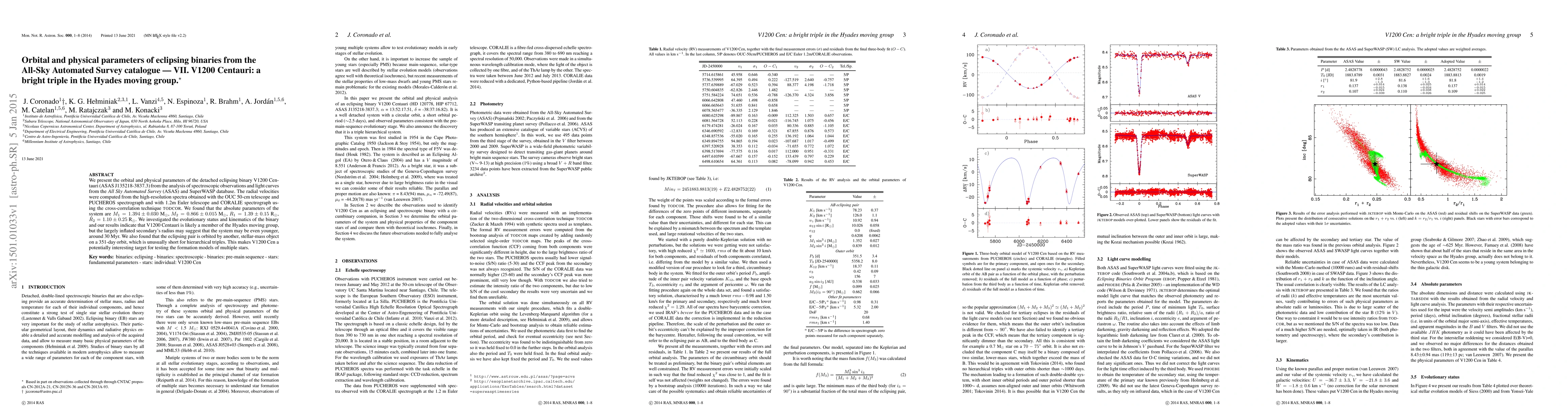 We present the orbital and physical parameters of the detached eclipsing binary V1200~Centauri (ASAS~J135218-3837.3) from the analysis of spectroscopic observations and light curves from the \textit{All Sky Automated Survey} (ASAS) and SuperWASP database. The radial velocities were computed from the high-resolution spectra obtained with the OUC 50-cm telescope and PUCHEROS spectrograph and with 1.2m Euler telescope and CORALIE spectrograph using the cross-correlation technique \textsc{todcor}. We found that the absolute parameters of the system are $M_1= 1.394\pm 0.030$ M$_\odot$, $M_2= 0.866\pm 0.015$ M$_\odot$, $R_1= 1.39\pm 0.15$ R$_\odot$, $R_2= 1.10\pm 0.25$ R$_\odot$. We investigated the evolutionary status and kinematics of the binary and our results indicate that V1200~Centauri is likely a member of the Hyades moving group, but the largely inflated secondary's radius may suggest that the system may be even younger, around 30 Myr. We also found that the eclipsing pair is orbited by another, stellar-mass object on a 351-day orbit, which is unusually short for hierarchical triples. This makes V1200 Cen a potentially interesting target for testing the formation models of multiple stars.