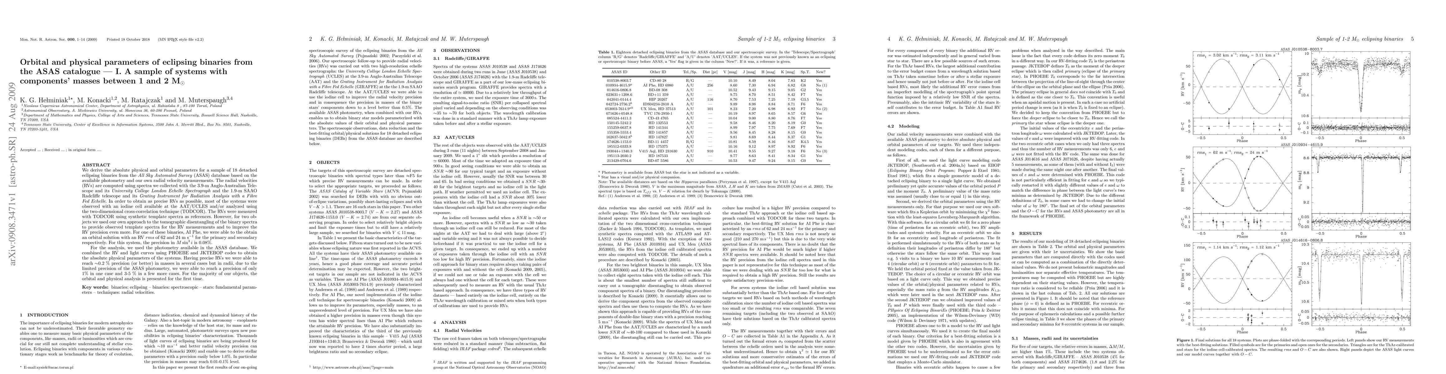 We derive the absolute physical and orbital parameters for a sample of 18 detached eclipsing binaries from the \emph{All Sky Automated Survey} (ASAS) database based on the available photometry and our own radial velocity measurements. The radial velocities (RVs) are computed using spectra we collected with the 3.9-m Anglo-Australian Telescope and its \emph{University College London Echelle Spectrograph} and the 1.9-m SAAO Radcliffe telescope and its \emph{Grating Instrument for Radiation Analysis with a Fibre Fed Echelle}. In order to obtain as precise RVs as possible, most of the systems were observed with an iodine cell available at the AAT/UCLES and/or analyzed using the two-dimensional cross-correlation technique (TODCOR). The RVs were measured with TODCOR using synthetic template spectra as references. However, for two objects we used our own approach to the tomographic disentangling of the binary spectra to provide observed template spectra for the RV measurements and to improve the RV precision even more. For one of these binaries, AI Phe, we were able to the obtain an orbital solution with an RV $rms$ of 62 and 24 m s$^{-1}$ for the primary and secondary respectively. For this system, the precision in $M \sin^3{i}$ is 0.08%. For the analysis, we used the photometry available in the ASAS database. We combined the RV and light curves using PHOEBE and JKTEBOP codes to obtain the absolute physical parameters of the systems. Having precise RVs we were able to reach $\sim$0.2 % precision (or better) in masses in several cases but in radii, due to the limited precision of the ASAS photometry, we were able to reach a precision of only 1% in one case and 3-5 % in a few more cases. For the majority of our objects, the orbital and physical analysis is presented for the first time.