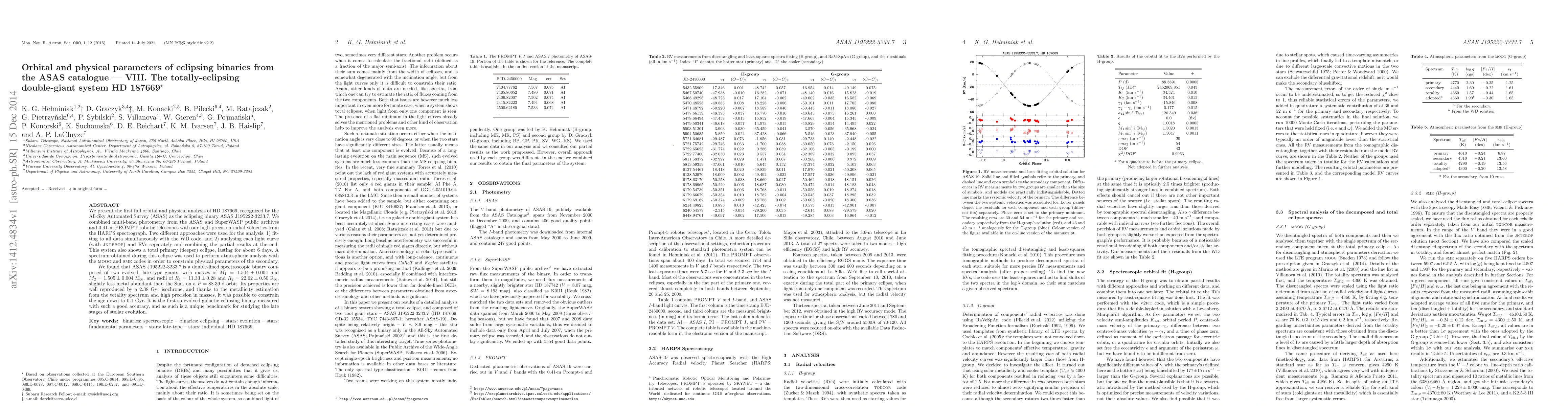 We present the first full orbital and physical analysis of HD 187669, recognized by the All-Sky Automated Survey (ASAS) as the eclipsing binary ASAS J195222-3233.7. We combined multi-band photometry from the ASAS and SuperWASP public archives and 0.41-m PROMPT robotic telescopes with our high-precision radial velocities from the HARPS spectrograph. Two different approaches were used for the analysis: 1) fitting to all data simultaneously with the WD code, and 2) analysing each light curve (with JKTEBOP) and RVs separately and combining the partial results at the end. This system also shows a total primary (deeper) eclipse, lasting for about 6 days. A spectrum obtained during this eclipse was used to perform atmospheric analysis with the MOOG and SME codes in order to constrain physical parameters of the secondary. We found that ASAS J195222-3233.7 is a double-lined spectroscopic binary composed of two evolved, late-type giants, with masses of $M_1 = 1.504\pm0.004$ and $M_2=1.505\pm0.004$ M$_\odot$, and radii of $R_1 = 11.33\pm0.28$ and $R_2=22.62\pm0.50$ R$_\odot$, slightly less metal abundant than the Sun, on a $P=88.39$ d orbit. Its properties are well reproduced by a 2.38 Gyr isochrone, and thanks to the metallicity estimation from the totality spectrum and high precision in masses, it was possible to constrain the age down to 0.1 Gyr. It is the first so evolved galactic eclipsing binary measured with such a good accuracy, and as such is a unique benchmark for studying the late stages of stellar evolution.