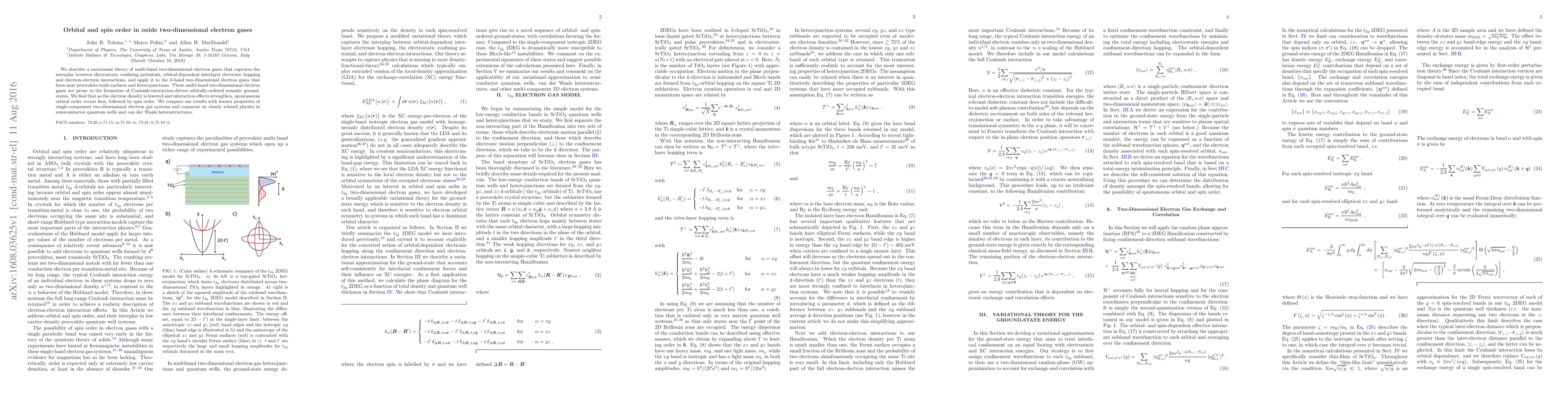 This paper develops a variational theory to explore the behavior of multi-band two-dimensional electron gases in perovskite oxides, revealing that orbital order emerges before spin order under reduced electron density and strong electron-electron interactions. The findings are compared to single-component systems and related to semiconductor quantum wells and van der Waals heterostructures.