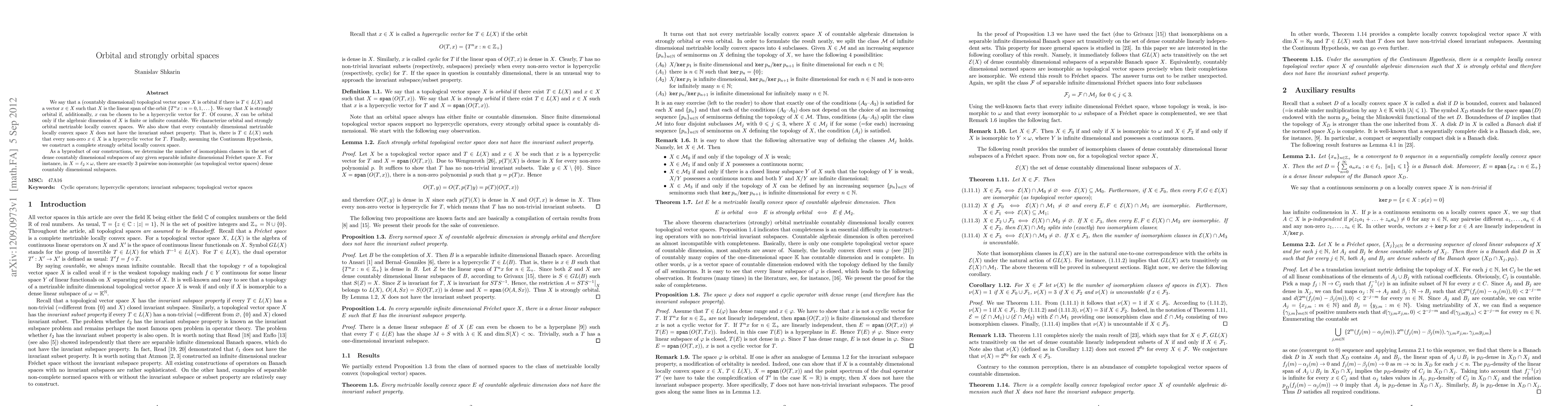 We say that a (countably dimensional) topological vector space $X$ is orbital if there is $T\in L(X)$ and a vector $x\in X$ such that $X$ is the linear span of the orbit ${T^nx:n=0,1,...}$. We say that $X$ is strongly orbital if, additionally, $x$ can be chosen to be a hypercyclic vector for $T$. Of course, $X$ can be orbital only if the algebraic dimension of $X$ is finite or infinite countable. We characterize orbital and strongly orbital metrizable locally convex spaces. We also show that every countably dimensional metrizable locally convex space $X$ does not have the invariant subset property. That is, there is $T\in L(X)$ such that every non-zero $x\in X$ is a hypercyclic vector for $T$. Finally, assuming the Continuum Hypothesis, we construct a complete strongly orbital locally convex space. As a byproduct of our constructions, we determine the number of isomorphism classes in the set of dense countably dimensional subspaces of any given separable infinite dimensional Fr\'echet space $X$. For instance, in $X=\ell_2\times \omega$, there are exactly 3 pairwise non-isomorphic (as topological vector spaces) dense countably dimensional subspaces.