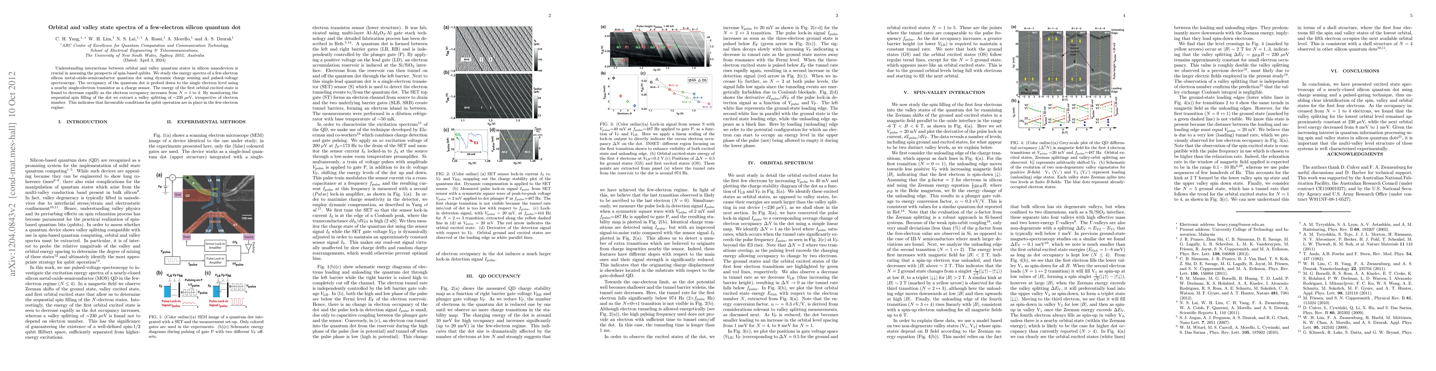 This paper investigates the interaction between orbital and valley quantum states in a few-electron silicon quantum dot using dynamic charge sensing and pulsed-voltage spectroscopy. The study finds a significant decrease in the first orbital excited state energy with increasing electron occupancy and a consistent valley splitting of ~230 μeV, suggesting favorable conditions for spin-based qubit operation.