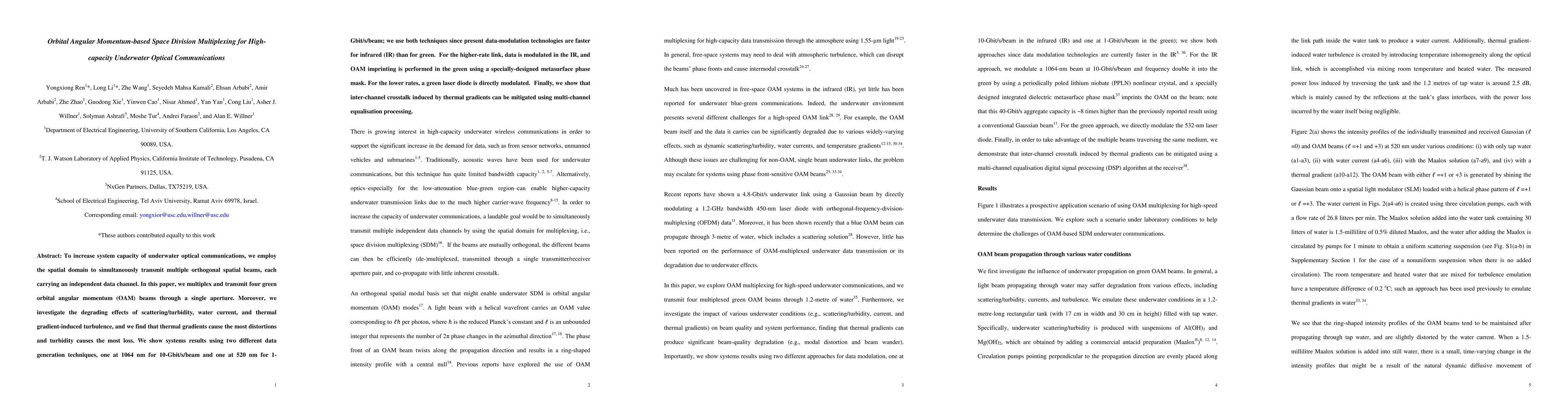 This paper explores the use of orbital angular momentum (OAM)-based space division multiplexing to enhance the capacity of underwater optical communications by transmitting multiple orthogonal spatial beams. It demonstrates the transmission of four OAM beams through a single aperture, addressing the impact of environmental factors like scattering and turbulence, and showing that thermal gradients cause the most distortions while turbidity leads to the most loss.