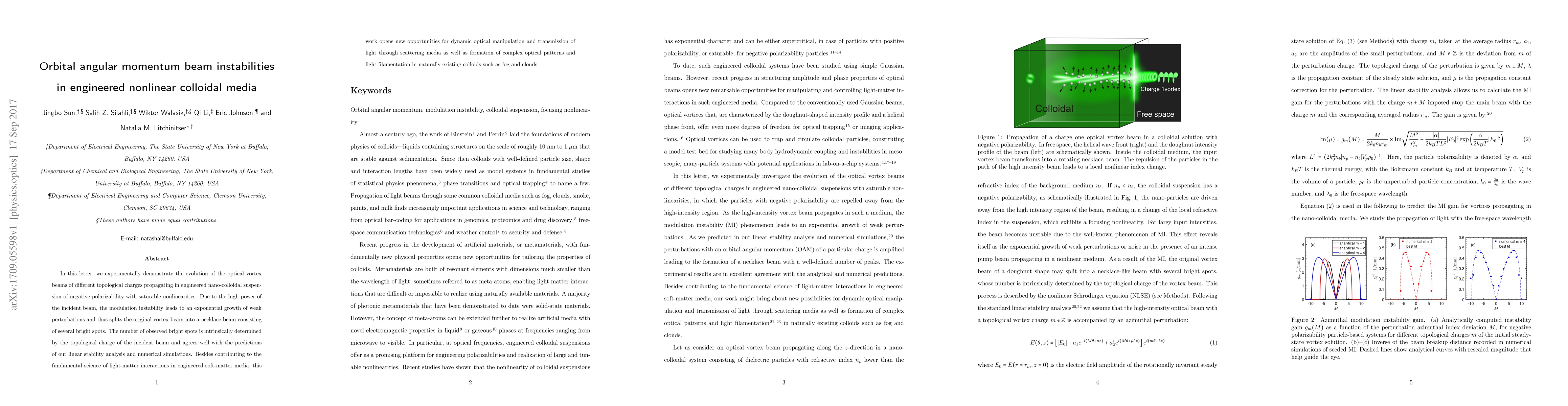 This paper demonstrates the evolution of optical vortex beams in engineered nano-colloidal suspensions, showing how high-power beams can split into necklace beams due to modulation instability, with the number of bright spots determined by the beam's topological charge. The findings advance understanding of light-matter interactions and suggest applications in optical manipulation and pattern formation.