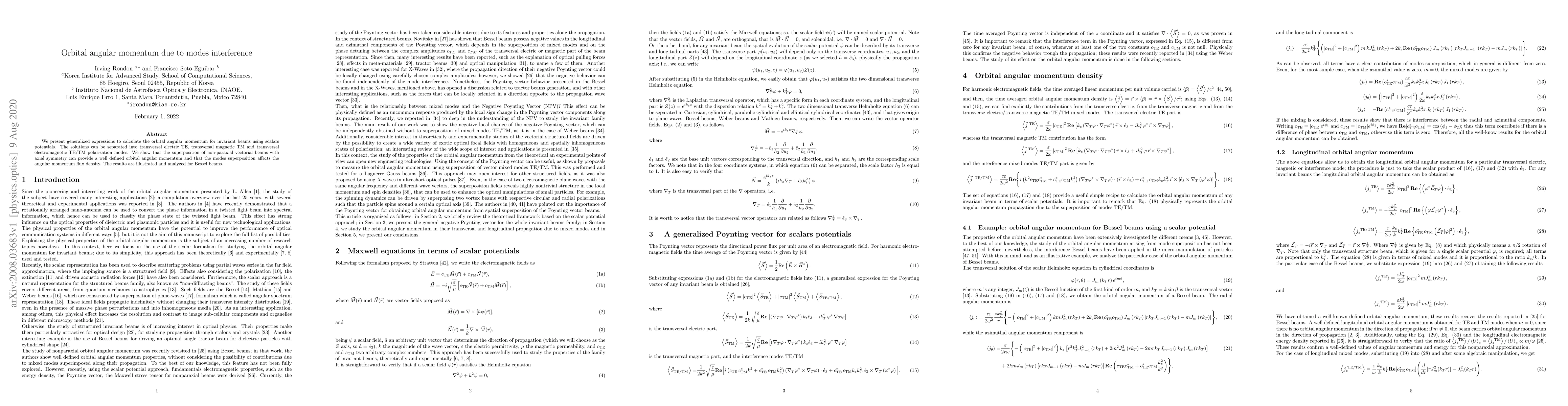 We present generalized expressions to calculate the orbital angular momentum for invariant beams using scalars potentials. The solutions can be separated into transversal electric TE, transversal magnetic TM and transversal electromagnetic TE/TM polarization modes. We show that the superposition of non-paraxial vectorial beams with axial symmetry can provide a well defined orbital angular momentum and that the modes superposition affects the angular momentum flux density. The results are illustrated and analyzed for Bessel beams.