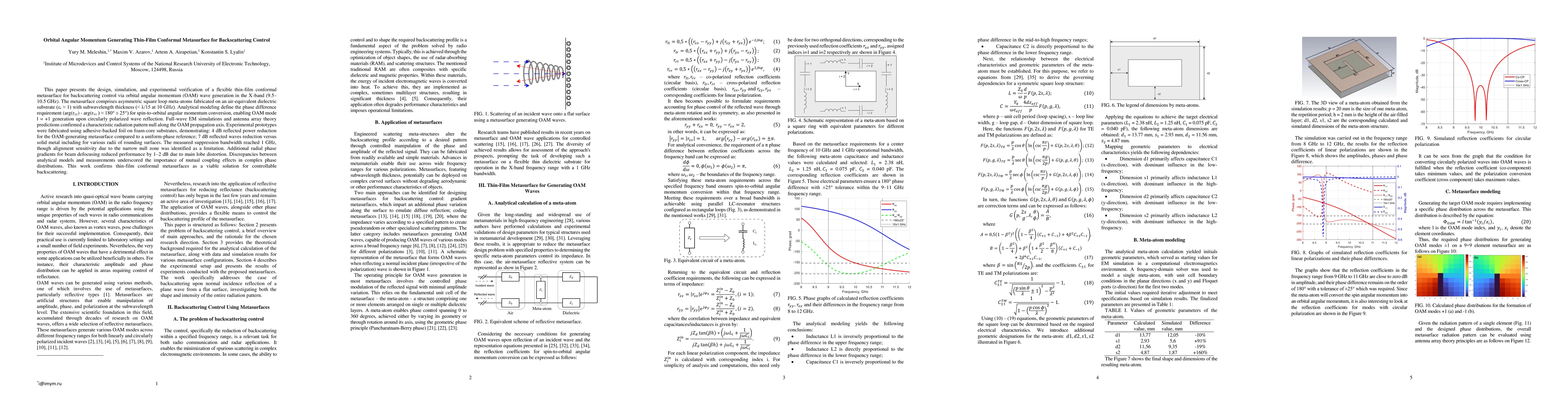 This paper presents the design, simulation, and experimental verification of a flexible thin-film conformal metasurface for backscattering control via orbital angular momentum (OAM) wave generation in the X-band (9.5-10.5 GHz). The metasurface comprises asymmetric square loop meta-atoms fabricated on an air-equivalent dielectric substrate with subwavelength thickness (lambda/15 at 10 GHz). Analytical modeling define the phase difference requirement (arg(ryy) - arg(rxx) = 180 +- 25 deg for spin-to-orbital angular momentum conversion, enabling OAM mode l = +1 generation upon circularly polarized wave reflection. Full-wave EM simulations and antenna array theory predictions confirmed a characteristic radiation pattern null along the OAM propagation axis. Experimental prototypes were fabricated using adhesive-backed foil on foam-core substrates, demonstrating: 4 dB reflected power reduction for the OAM-generating metasurface compared to a uniform-phase reference, 7 dB reflected waves reduction versus solid metal including for various radii of rounding surfaces. The measured suppression bandwidth reached 1 GHz, though alignment sensitivity due to the narrow null zone was identified as a limitation. Additional radial phase gradients for beam defocusing reduced performance by 1-2 dB due to main lobe distortion. Discrepancies between analytical models and measurements underscored the importance of mutual coupling effects in complex phase distributions. This work confirms thin-film conformal metasurfaces as a viable solution for controllable backscattering.
