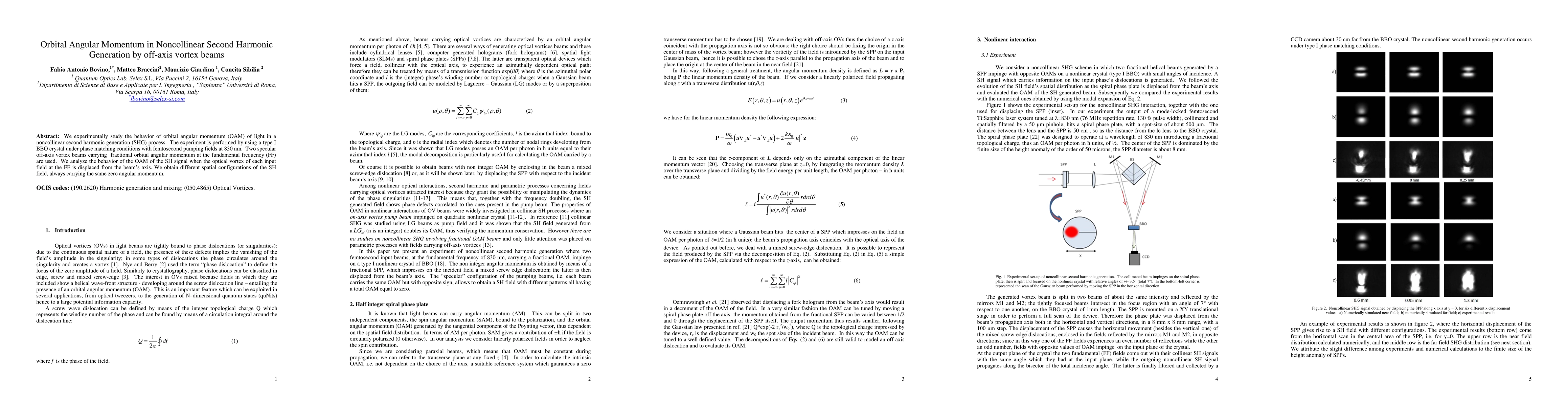 We experimentally study the behavior of orbital angular momentum (OAM) of light in a noncollinear second harmonic generation (SHG) process. The experiment is performed by using a type I BBO crystal under phase matching conditions with femtosecond pumping fields at 830 nm. Two specular off-axis vortex beams carrying fractional orbital angular momentum at the fundamental frequency (FF) are used. We analyze the behavior of the OAM of the SH signal when the optical vortex of each input field at the FF is displaced from the beam's axis. We obtain different spatial configurations of the SH field, always carrying the same zero angular momentum.