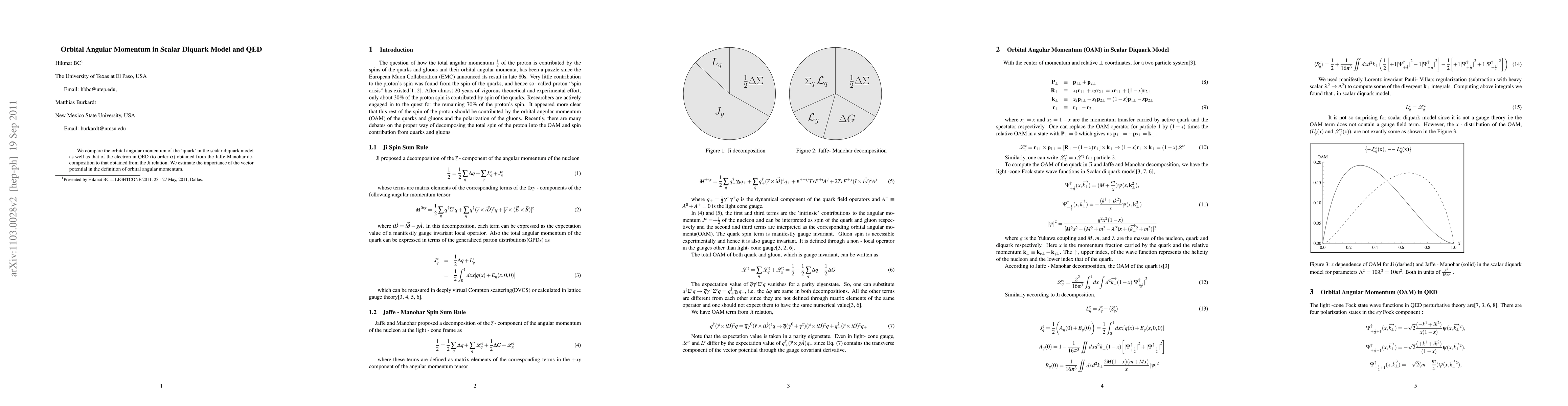 The research compares the orbital angular momentum (OAM) of a 'quark' in the scalar diquark model with that of an electron in Quantum Electrodynamics (QED) to order α, using the Jaffe-Manohar decomposition and the Ji relation. It estimates the significance of the vector potential in the definition of OAM.