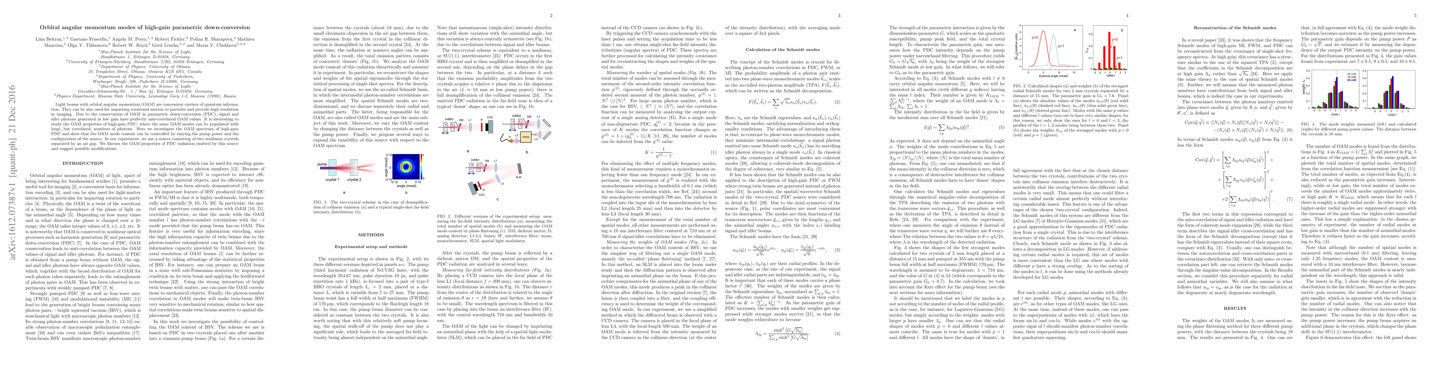 This paper investigates the orbital angular momentum (OAM) modes in high-gain parametric down-conversion (PDC) and demonstrates control over the OAM mode content by adjusting pump power and source configuration. The study uses a dual-crystal PDC source with an air gap and explores the implications for quantum information and imaging applications.