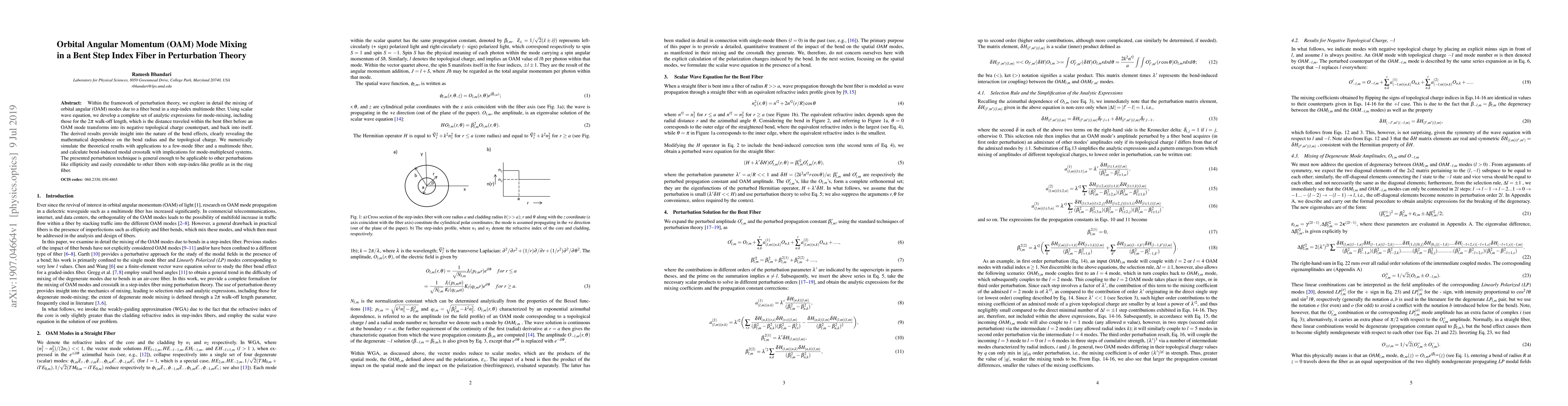 This paper investigates the mixing of orbital angular momentum modes in a bent step-index fiber using perturbation theory, deriving analytical expressions for mode-mixing and the $2\pi$ walk-off length. The results reveal the mathematical dependence on bend radius and topological charge, with implications for mode-multiplexed systems and potential applications to other fiber perturbations.