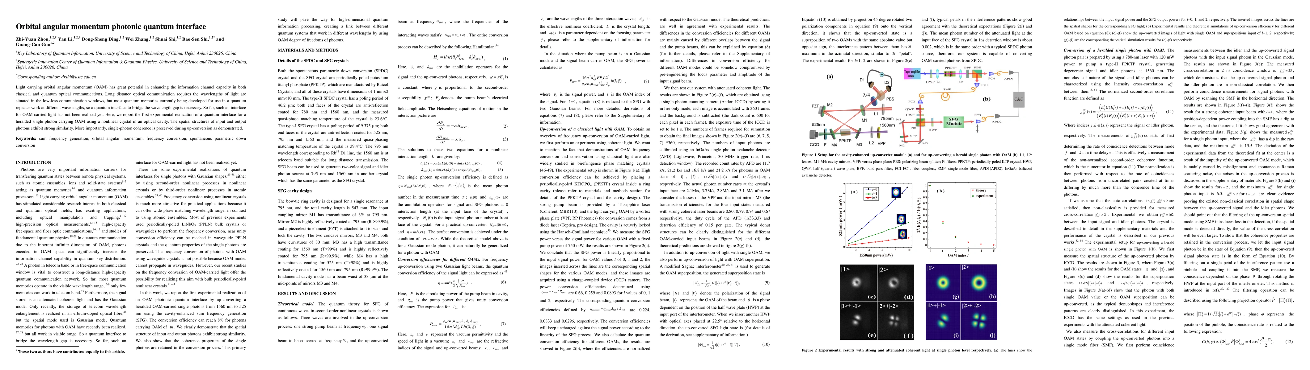 This paper presents the first experimental realization of a quantum interface for a single photon carrying orbital angular momentum (OAM) using a nonlinear crystal in an optical cavity. The interface preserves single-photon coherence and spatial structure similarity, addressing the need for bridging wavelength gaps in long-distance optical communication systems.