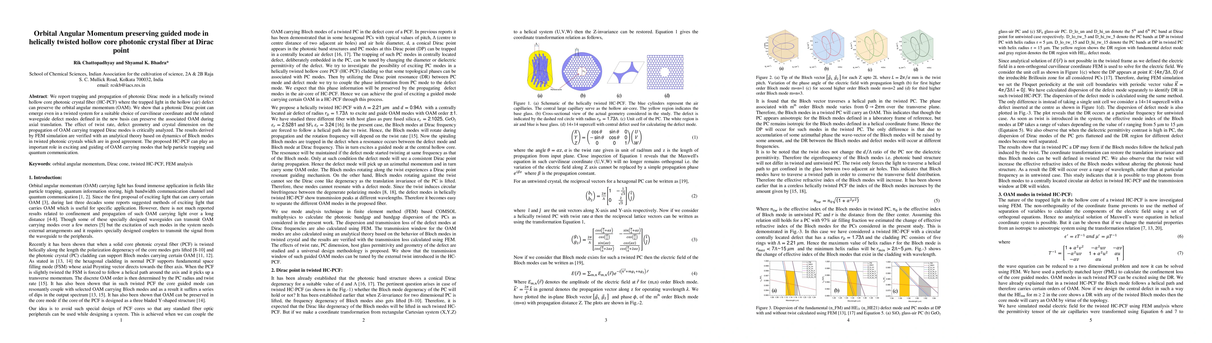 This paper reports on the trapping and propagation of photonic Dirac modes in helically twisted hollow core photonic crystal fibers, preserving orbital angular momentum. The study analyzes the influence of twist rate, defect geometry, and fiber dimensions on OAM-carrying modes, validated by both FEM simulations and analytical theory, suggesting potential applications in particle trapping and quantum communication.