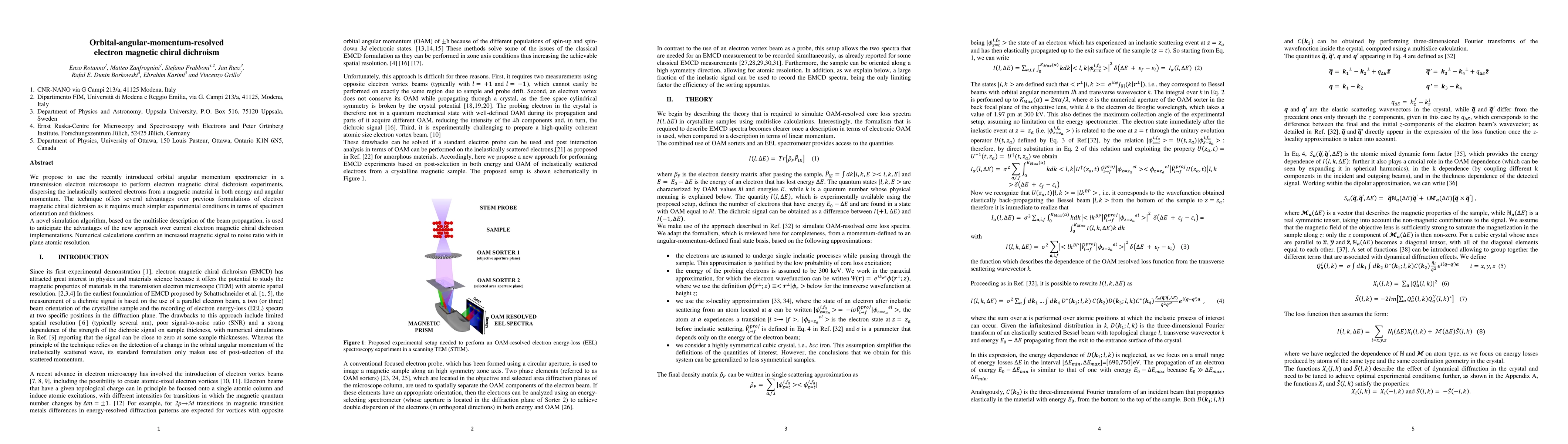 We propose a highly efficient atomically-resolved mode of electron magnetic chiral dichroism. This method exploits the recently introduced orbital angular momentum spectrometer to analyze the inelastically scattered electrons allowing for simultaneous dispersion in both energy and angular momentum. The technique offers several advantages over previous formulations of electron magnetic chiral dichroism as it requires much simpler experimental conditions in terms of specimen orientation and thickness. A novel simulation algorithm, based on the multislice description of the beam propagation, is used to anticipate the advantages of the new approach over current electron magnetic chiral dichroism implementations. Numerical calculations confirm an increased magnetic signal to noise ratio with in plane atomic resolution.
