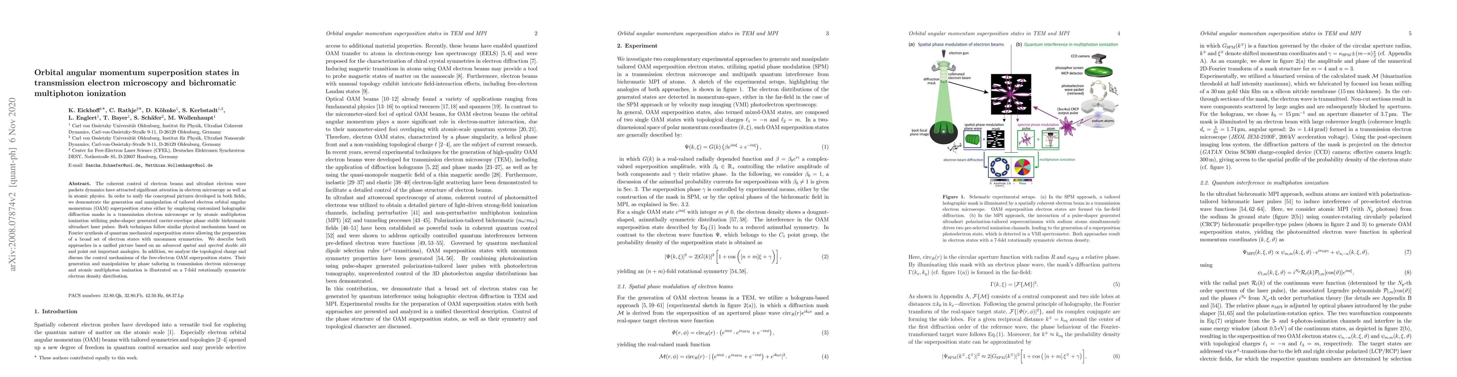 This paper demonstrates the generation and manipulation of electron orbital angular momentum (OAM) superposition states using both transmission electron microscopy and bichromatic multiphoton ionization, highlighting the unified physical mechanisms and topological control of these states. The study showcases the preparation of electron states with unique symmetries through advanced spatial and spectral techniques.