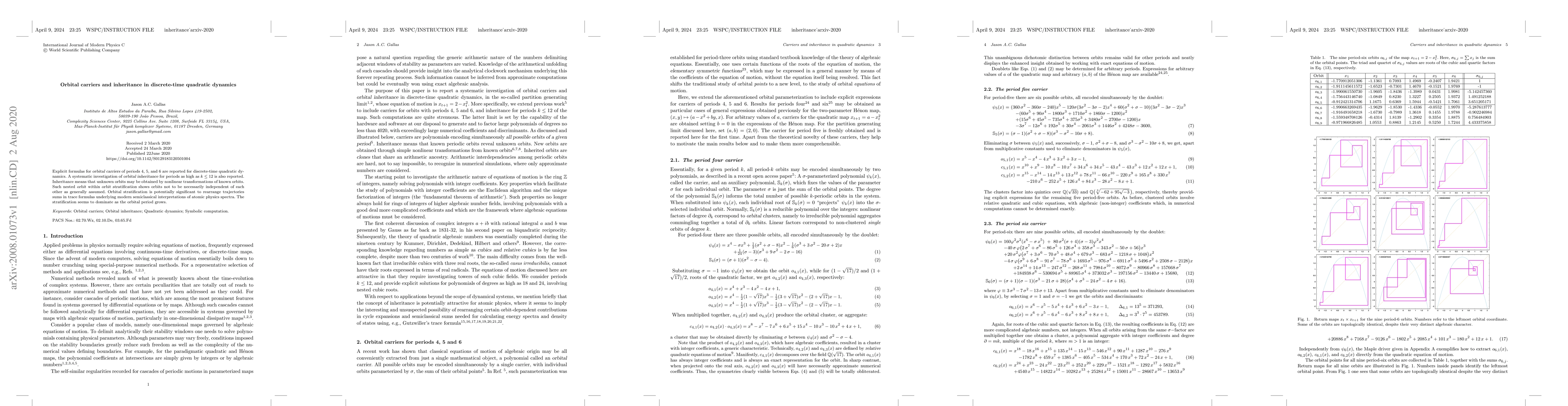 Explicit formulas for {\sl orbital carriers} of periods $4$, $5$, and $6$ are reported for discrete-time quadratic dynamics. A systematic investigation of {\sl orbital inheritance} for periods as high as $k\leq 12$ is also reported. Inheritance means that unknown orbits may be obtained by nonlinear transformations of known orbits. Such nested {\sl orbit within orbit stratification} shows orbits not to be necessarily independent of each other as generally assumed. Orbital stratification is potentially significant to rearrange trajectories sums in trace formulas underlying modern semiclassical interpretations of atomic physics spectra. The stratification seems to dominate as the orbital period grows.