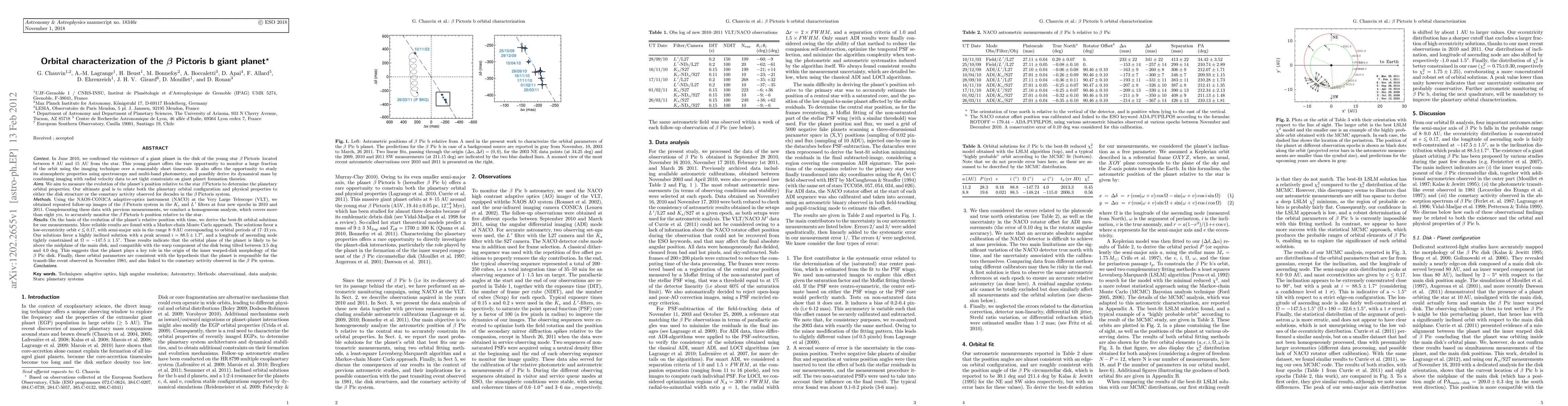 This study confirms the existence of the giant planet Beta Pictoris b, analyzing its orbit using adaptive-optics imaging over eight years. The derived best-fit orbital parameters suggest a low-eccentricity orbit with a semi-major axis of 8-9 AU, indicating the planet's significant role in shaping the disk's warped morphology.