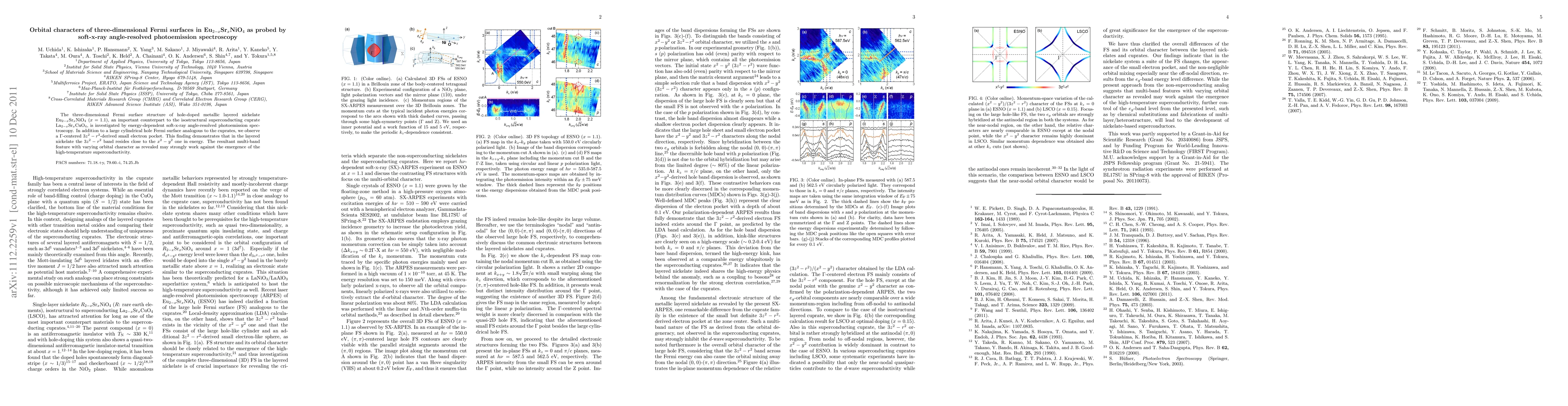 The study investigates the Fermi surface structure of hole-doped nickelate Eu2-xSrxNiO4 using soft-x-ray angle-resolved photoemission spectroscopy, revealing a large cylindrical hole Fermi surface and a Gamma-centered electron pocket derived from the 3z2-r2 band. The presence of a multi-band feature with differing orbital characters suggests a hindrance to high-temperature superconductivity.