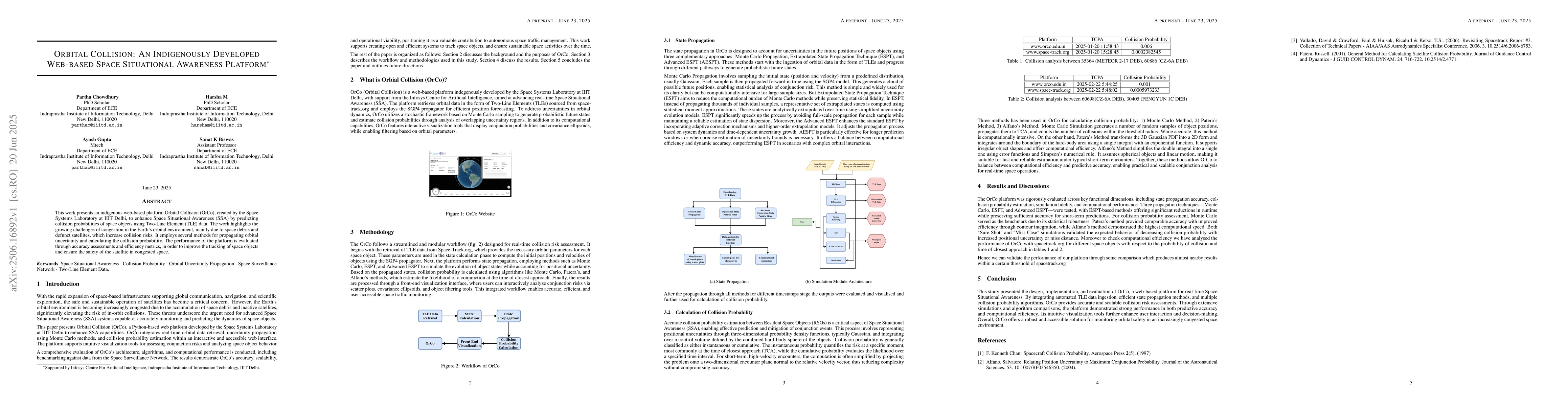 This work presents an indigenous web based platform Orbital Collision (OrCo), created by the Space Systems Laboratory at IIIT Delhi, to enhance Space Situational Awareness (SSA) by predicting collision probabilities of space objects using Two Line Elements (TLE) data. The work highlights the growing challenges of congestion in the Earth's orbital environment, mainly due to space debris and defunct satellites, which increase collision risks. It employs several methods for propagating orbital uncertainty and calculating the collision probability. The performance of the platform is evaluated through accuracy assessments and efficiency metrics, in order to improve the tracking of space objects and ensure the safety of the satellite in congested space.