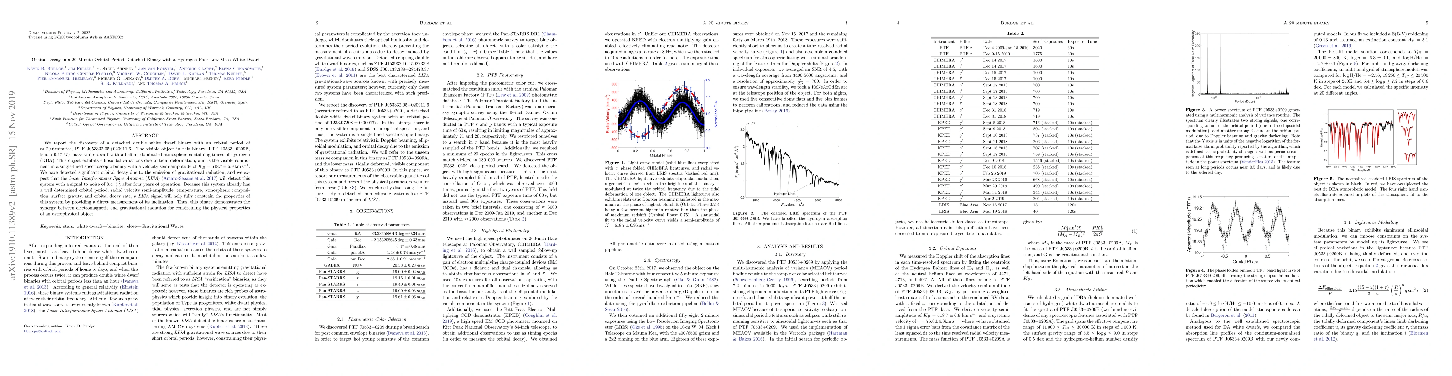 This paper presents a detached double white dwarf binary with a 20.6-minute orbital period, showing significant orbital decay due to gravitational radiation. The system, PTF J053332.05+020911.6, includes a helium-dominated, hydrogen-trace white dwarf, and is expected to be detected by LISA, providing insights into its inclination and reinforcing the synergy between electromagnetic and gravitational observations.