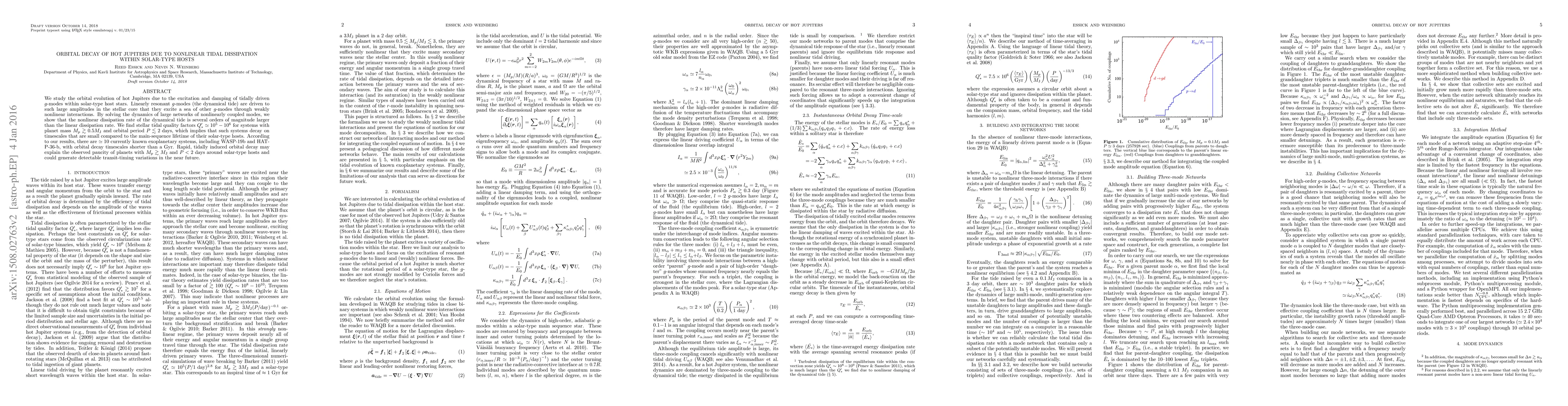 This paper investigates the rapid orbital decay of hot Jupiters due to nonlinear tidal dissipation in solar-type stars, finding that nonlinear interactions significantly enhance the decay rate compared to linear models. The study predicts decay timescales much shorter than stellar main-sequence lifetimes for some systems, potentially explaining the scarcity of such planets.