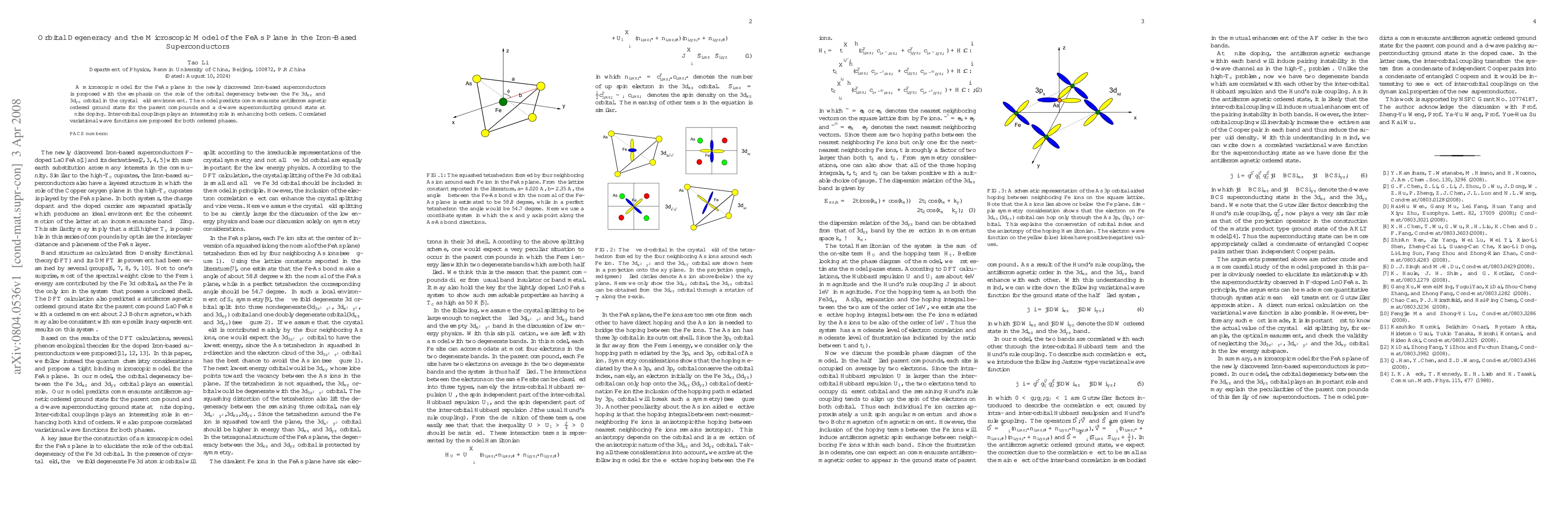This paper proposes a microscopic model for the FeAs plane in iron-based superconductors, highlighting the orbital degeneracy between Fe $3d_{xz}$ and $3d_{yz}$ orbitals. It predicts a commensurate antiferromagnetic ground state and d-wave superconductivity, with inter-orbital couplings enhancing both orders.
