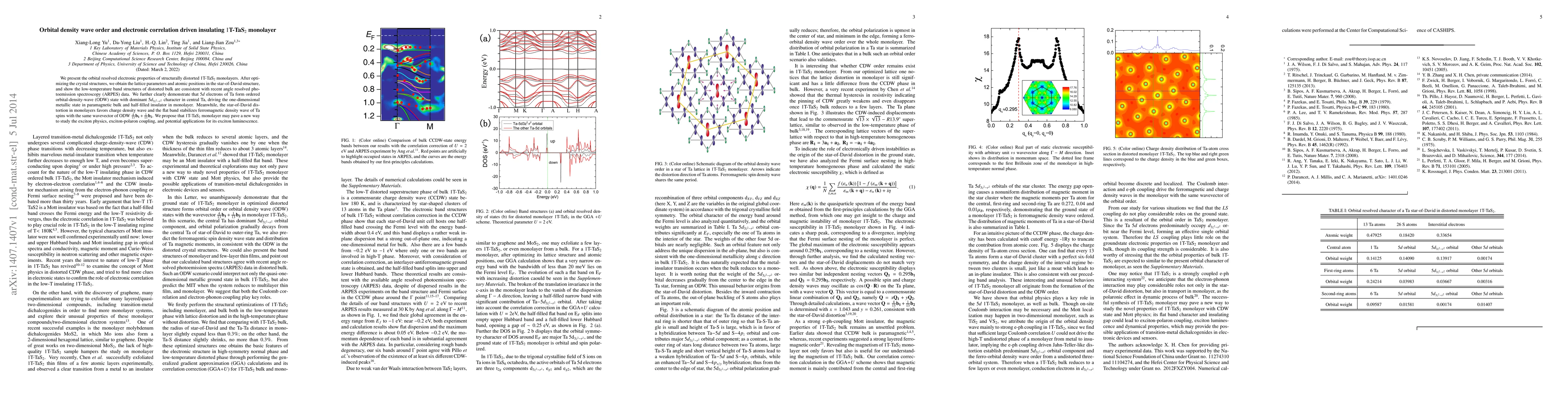 We present the orbital resolved electronic properties of structurally distorted 1T-TaS2 monolayers. After optimizing the crystal structures, we obtain the lattice parameters and atomic positions in the star-of-David structure, and show the low-temperature band structures of distorted bulk are consistent with recent angle resolved photoemission spectroscopy (ARPES) data. We further clearly demonstrate that $5d$ electrons of Ta form ordered orbital-density-wave (ODW) state with dominant $5d_{3{z}^2-{r}^2}$ character in central Ta, driving the one-dimensional metallic state in paramagnetic bulk and half-filled insulator in monolayer. Meanwhile, the star-of-David distortion in monolayers favors charge density wave and the flat band stabilizes ferromagnetic density wave of Ta spins with the same wavevector of ODW 4/13 b_1+1/13 b2. We propose that $1$T-TaS$_{2}$ monolayer may pave a new way to study the exciton physics, exciton-polaron coupling, and potential applications for its exciton luminescence.