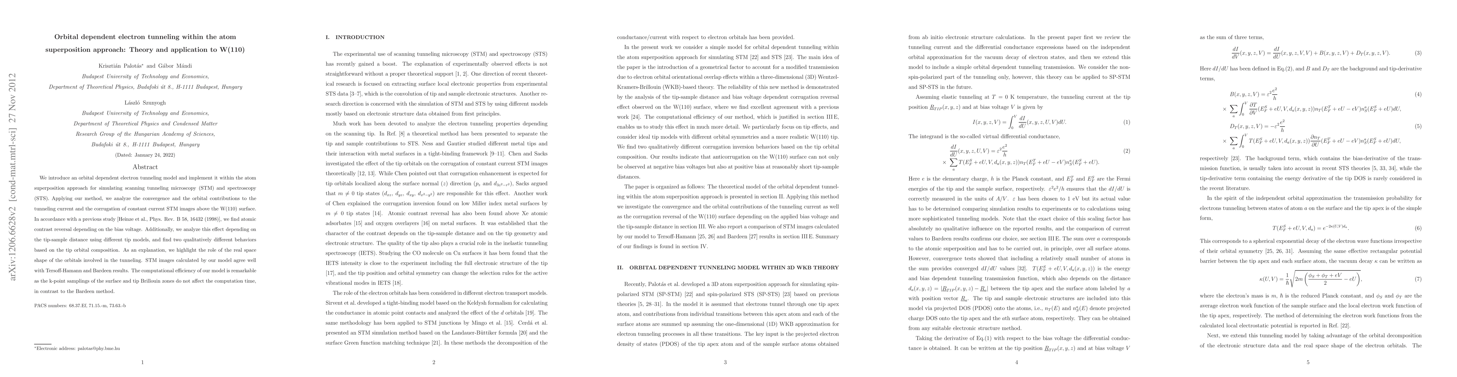 We introduce an orbital dependent electron tunneling model and implement it within the atom superposition approach for simulating scanning tunneling microscopy (STM) and spectroscopy (STS). Applying our method, we analyze the convergence and the orbital contributions to the tunneling current and the corrugation of constant current STM images above the W(110) surface. In accordance with a previous study [Heinze et al., Phys. Rev. B 58, 16432 (1998)], we find atomic contrast reversal depending on the bias voltage. Additionally, we analyze this effect depending on the tip-sample distance using different tip models, and find two qualitatively different behaviors based on the tip orbital composition. As an explanation, we highlight the role of the real space shape of the orbitals involved in the tunneling. STM images calculated by our model agree well with Tersoff-Hamann and Bardeen results. The computational efficiency of our model is remarkable as the k-point samplings of the surface and tip Brillouin zones do not affect the computation time, in contrast to the Bardeen method.