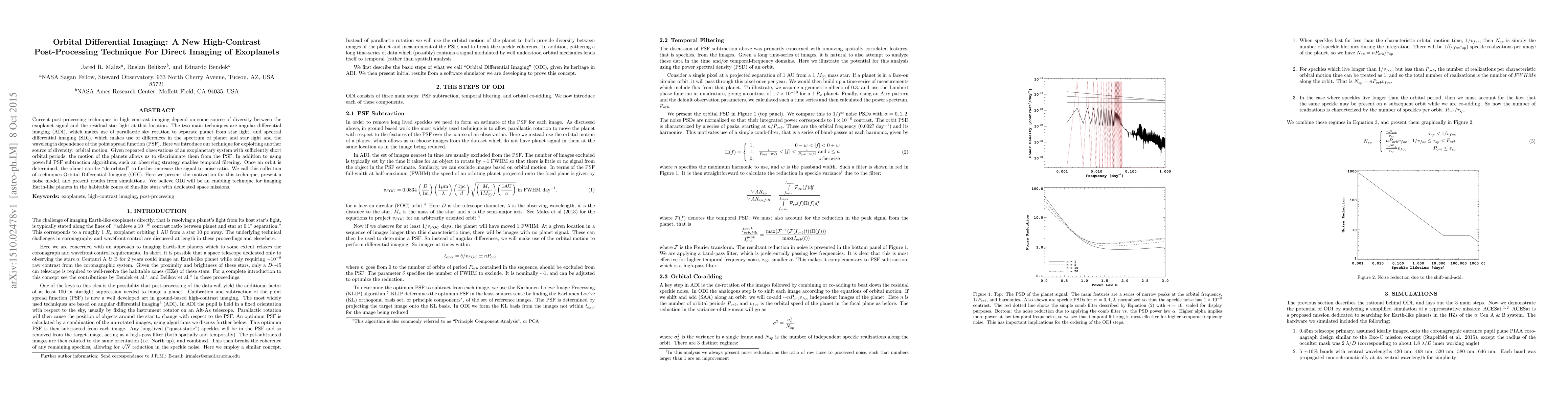 Orbital Differential Imaging (ODI) leverages the orbital motion of exoplanets to enhance high-contrast imaging, distinguishing planets from starlight through temporal filtering and PSF subtraction. This new technique promises improved detection of Earth-like planets in habitable zones, supported by simulation results and a detailed noise model.