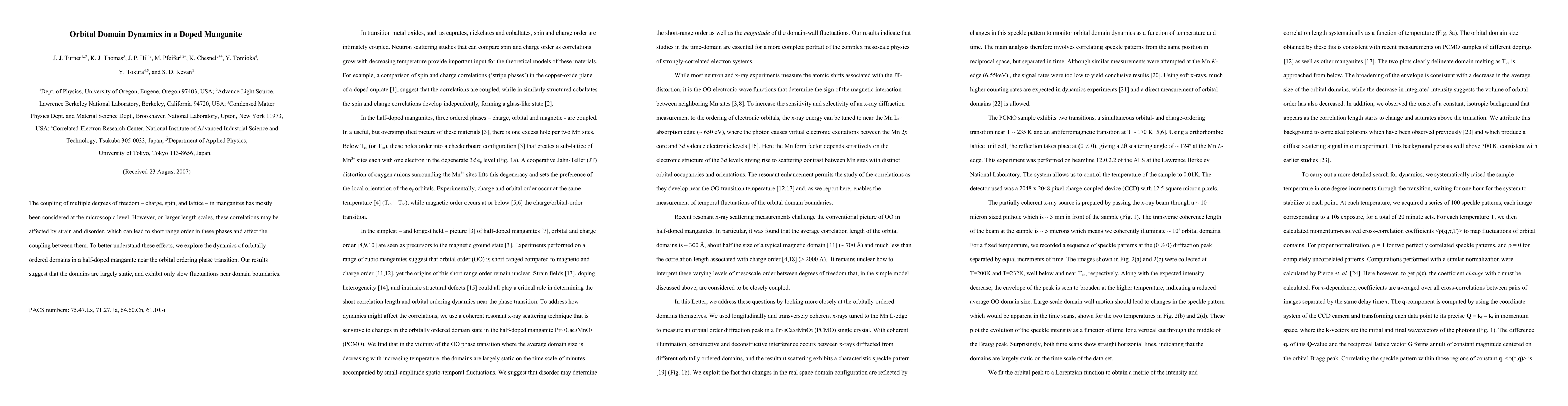 The coupling of multiple degrees of freedom - charge, spin, and lattice - in manganites has mostly been considered at the microscopic level. However, on larger length scales, these correlations may be affected by strain and disorder, which can lead to short range order in these phases and affect the coupling between them. To better understand these effects, we explore the dynamics of orbitally ordered domains in a half-doped manganite near the orbital ordering phase transition. Our results suggest that the domains are largely static, and exhibit only slow fluctuations near domain boundaries.