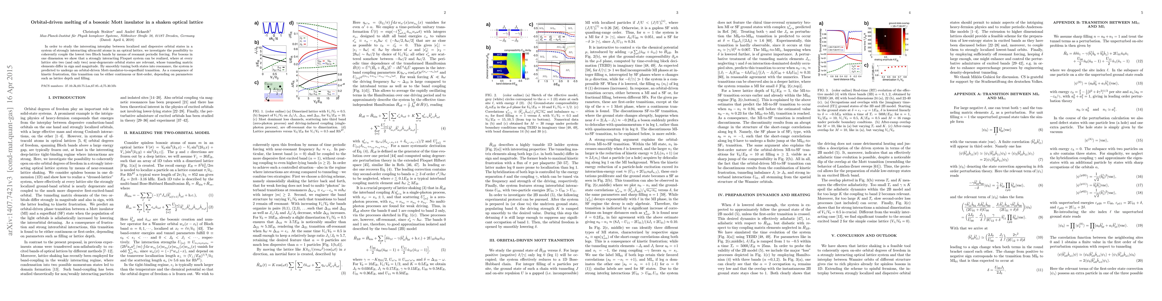 In order to study the interplay between localized and dispersive orbital states in a system of ultracold atoms in an optical lattice, we investigate the possibility to coherently couple the lowest two Bloch bands by means of resonant periodic forcing. Considering bosons in one dimension, it is shown that a strongly interacting Floquet system can be realized, where at every lattice site two (and only two) near-degenerate orbital states are relevant. By smoothly tuning both states into resonance we find that the system can undergo an orbital-driven Mott-insulator-to-superfluid transition. As an intriguing consequence of the kinetic frustration in the system, this transition can be either continuous or first-order, depending on parameters such as lattice depth and filling.