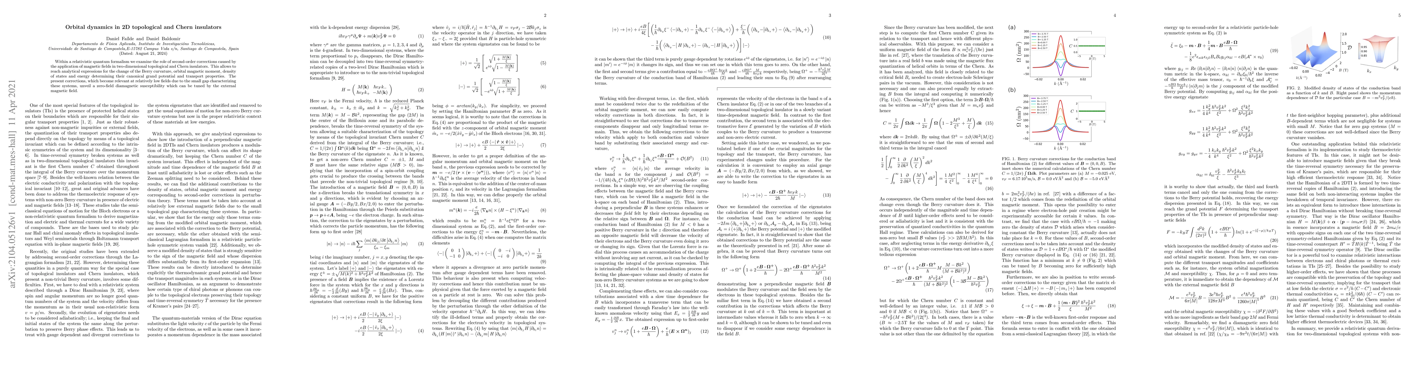 Within a relativistic quantum formalism we examine the role of second-order corrections caused by the application of magnetic fields in two-dimensional topological and Chern insulators. This allows to reach analytical expressions for the change of the Berry curvature, orbital magnetic moment, density of states and energy determining their canonical grand potential and transport properties. The present corrections, which become relevant at relatively low fields due to the small gap characterizing these systems, unveil a zero-field diamagnetic susceptibility which can be tuned by the external magnetic field.