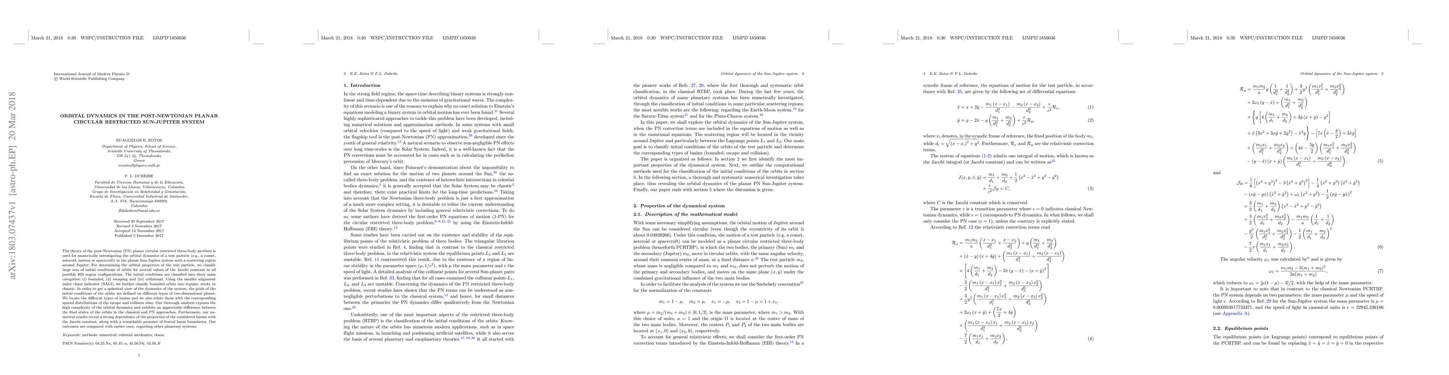 The theory of the post-Newtonian (PN) planar circular restricted three-body problem is used for numerically investigating the orbital dynamics of a test particle (e.g., a comet, asteroid, meteor or spacecraft) in the planar Sun-Jupiter system with a scattering region around Jupiter. For determining the orbital properties of the test particle, we classify large sets of initial conditions of orbits for several values of the Jacobi constant in all possible Hill region configurations. The initial conditions are classified into three main categories: (i) bounded, (ii) escaping and (iii) collisional. Using the smaller alignment index chaos indicator (SALI), we further classify bounded orbits into regular, sticky or chaotic. In order to get a spherical view of the dynamics of the system, the grids of the initial conditions of the orbits are defined on different types of two-dimensional planes. We locate the different types of basins and we also relate them with the corresponding spatial distributions of the escape and collision time. Our thorough analysis exposes the high complexity of the orbital dynamics and exhibits an appreciable difference between the final states of the orbits in the classical and PN approaches. Furthermore, our numerical results reveal a strong dependence of the properties of the considered basins with the Jacobi constant, along with a remarkable presence of fractal basin boundaries. Our outcomes are compared with earlier ones, regarding other planetary systems.