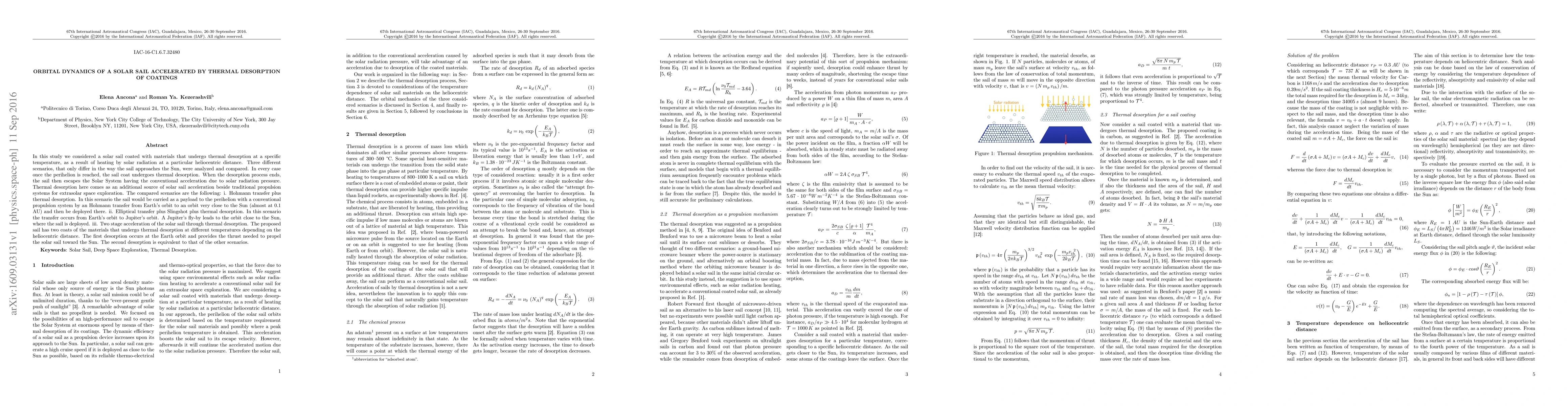 A study explores the orbital dynamics of solar sails accelerated by thermal desorption of coatings at different heliocentric distances, offering an alternative propulsion method for extrasolar space exploration.
