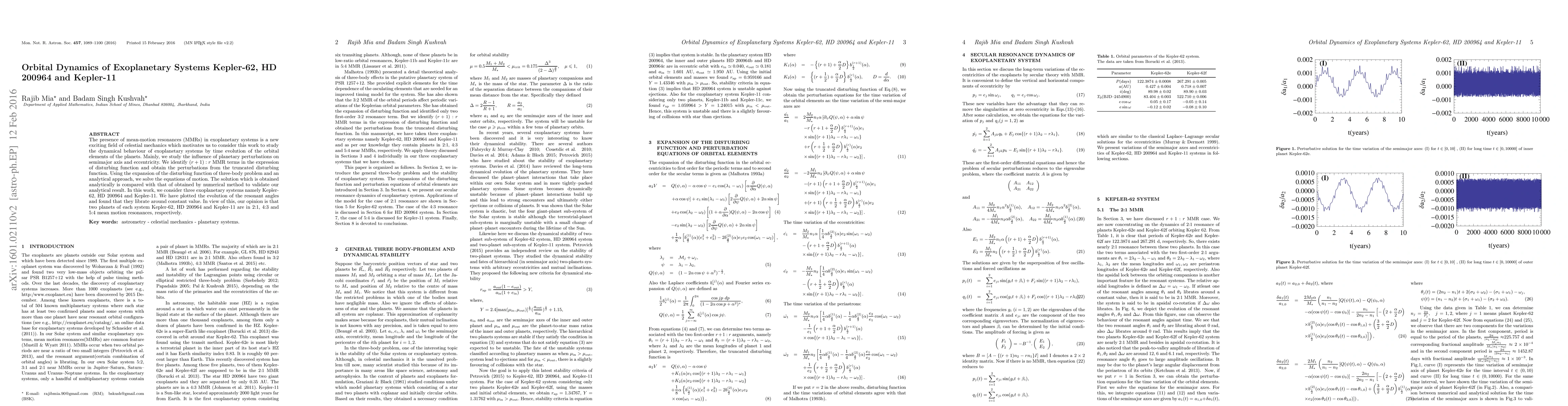 This research investigates the orbital dynamics of exoplanetary systems Kepler-62, HD 200964, and Kepler-11, focusing on mean-motion resonances and their influence on the planets' semimajor axes and eccentricities. Analytical and numerical methods are used to validate the presence of 2:1, 4:3, and 5:4 mean motion resonances in these systems.