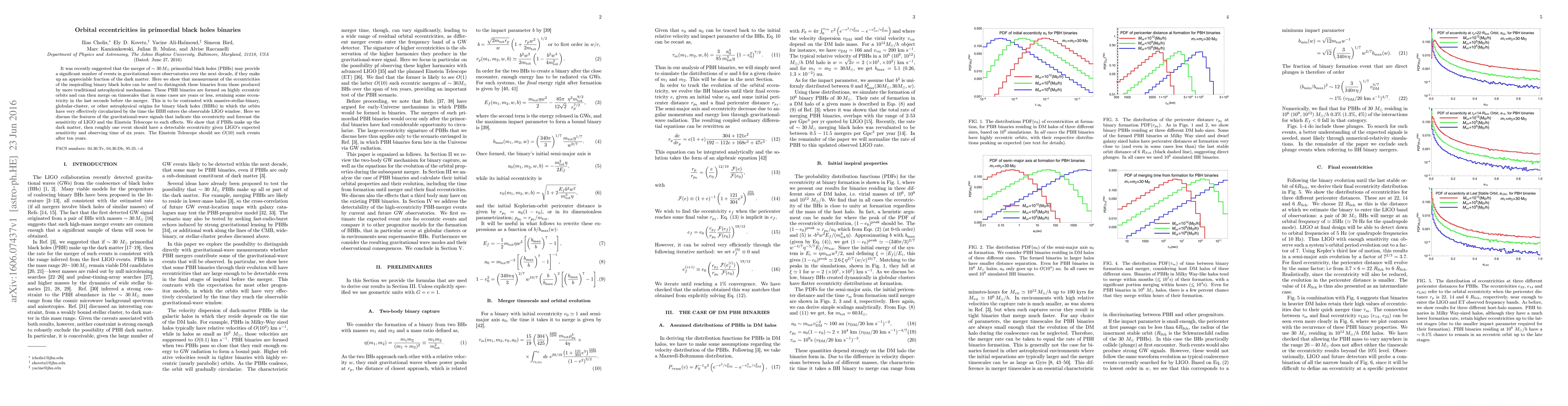 This paper investigates the eccentricities of primordial black hole binaries, suggesting that their gravitational-wave signals will retain detectable eccentricity due to their highly eccentric formation orbits. It forecasts that LIGO and the Einstein Telescope could observe several such events, distinguishing them from binaries formed through traditional astrophysical processes.