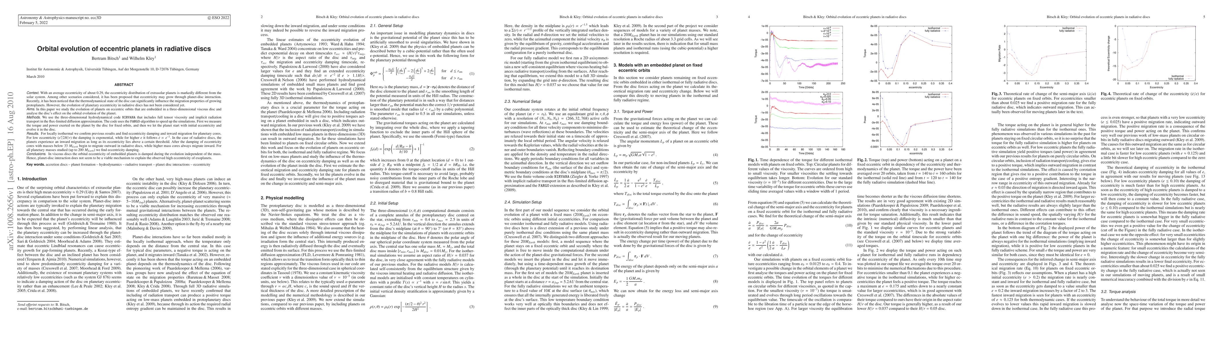 With an average eccentricity of about 0.29, the eccentricity distribution of extrasolar planets is markedly different from the solar system. Among other scenarios considered, it has been proposed that eccentricity may grow through planet-disc interaction. Recently, it has been noticed that the thermodynamical state of the disc can significantly influence the migration properties of growing protoplanets. However, the evolution of planetary eccentricity in radiative discs has not been considered yet. In this paper we study the evolution of planets on eccentric orbits that are embedded in a three-dimensional viscous disc and analyse the disc's effect on the orbital evolution of the planet. We use the three-dimensional hydrodynamical code NIRVANA that includes full tensor viscosity and implicit radiation transport in the flux-limited diffusion approximation. The code uses the FARGO-algorithm to speed up the simulations. First we measure the torque and power exerted on the planet by the disc for fixed orbits, and then we let the planet start with initial eccentricity and evolve it in the disc. For locally isothermal we confirm previous results and find eccentricity damping and inward migration for planetary cores. In the case of radiative discs, the planets experience an inward migration as long as its eccentricity lies above a certain threshold. After the damping of eccentricity cores with masses below 33 Earthmasses begin to migrate outward in radiative discs, while higher mass cores always migrate inward. For all planetary masses studied (up to 200 Earthmasses) we find eccentricity damping. In viscous discs the orbital eccentricity of embedded planets is damped during the evolution independent of the mass. Hence, planet-disc interaction does not seem to be a viable mechanism to explain the observed high eccentricity of exoplanets.