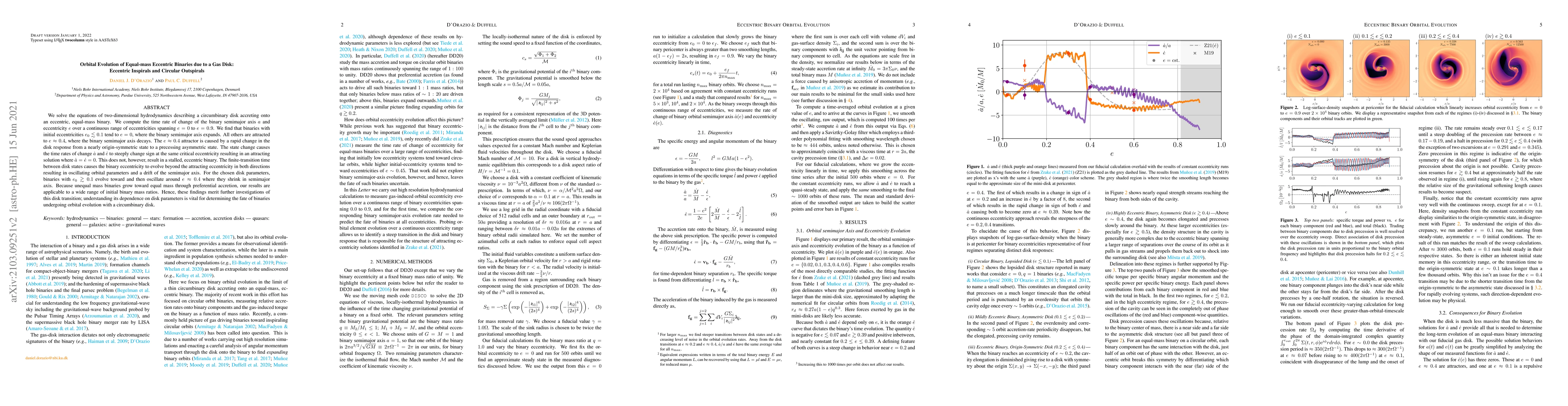 We solve the equations of two-dimensional hydrodynamics describing a circumbinary disk accreting onto an eccentric, equal-mass binary. We compute the time rate of change of the binary semimajor axis $a$ and eccentricity $e$ over a continuous range of eccentricities spanning $e=0$ to $e=0.9$. We find that binaries with initial eccentricities $e_0 \lesssim 0.1$ tend to $e=0$, where the binary semimajor axis expands. All others are attracted to $e \approx 0.4$, where the binary semimajor axis decays. The $e \approx 0.4$ attractor is caused by a rapid change in the disk response from a nearly origin-symmetric state to a precessing asymmetric state. The state change causes the time rates of change $\dot{a}$ and $\dot{e}$ to steeply change sign at the same critical eccentricity resulting in an attracting solution where $\dot{a} = \dot{e} = 0$. This does not, however, result in a stalled, eccentric binary. The finite-transition time between disk states causes the binary eccentricity to evolve beyond the attracting eccentricity in both directions resulting in oscillating orbital parameters and a drift of the semimajor axis. For the chosen disk parameters, binaries with $e_0 \gtrsim 0.1$ evolve toward and then oscillate around $e \approx 0.4$ where they shrink in semimajor axis. Because unequal mass binaries grow toward equal mass through preferential accretion, our results are applicable to a wide range of initial binary mass ratios. Hence, these findings merit further investigations of this disk transition; understanding its dependence on disk parameters is vital for determining the fate of binaries undergoing orbital evolution with a circumbinary disk.