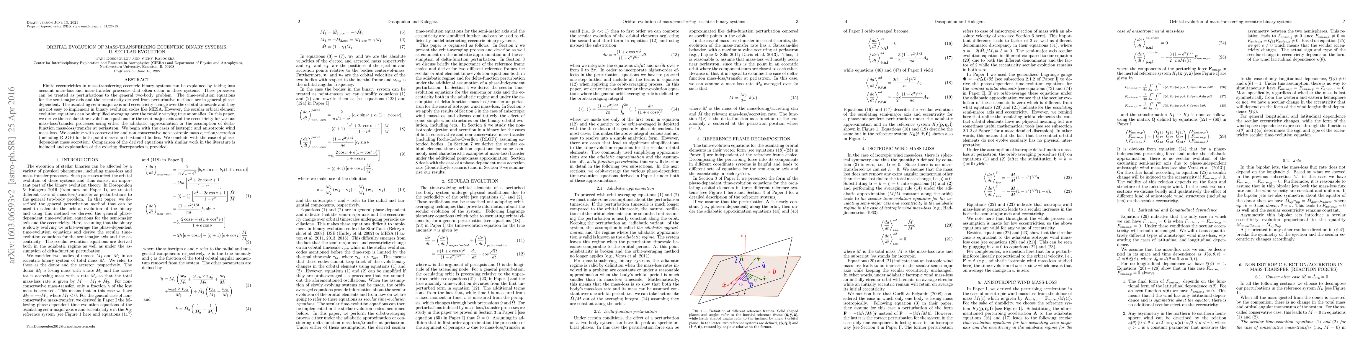 Finite eccentricities in mass-transferring eccentric binary systems can be explained by taking into account mass-loss and mass-transfer processes that often occur in these systems. These processes can be treated as perturbations to the general two-body problem. The time-evolution equations for the semi-major axis and the eccentricity derived from perturbative methods are in general phase-dependent. The osculating semi-major axis and eccentricity change over the orbital timescale and they are not easy to implement in binary evolution codes like MESA. However, the secular orbital element evolution equations can be simplified averaging over the rapidly varying true anomalies. In this paper, we derive the secular time-evolution equations for the semi-major axis and the eccentricity for various mass-loss/transfer processes using either the adiabatic approximation or the assumption of delta-function mass-loss/transfer at periastron. We begin with the cases of isotropic and anisotropic wind mass-loss. We continue with conservative and non-conservative non-isotropic mass ejection/accretion (including RLOF) for both point-masses and extended bodies. We conclude with the case of phase-dependent mass accretion. Comparison of the derived equations with similar work in the literature is included and explanation of the existing discrepancies is provided.