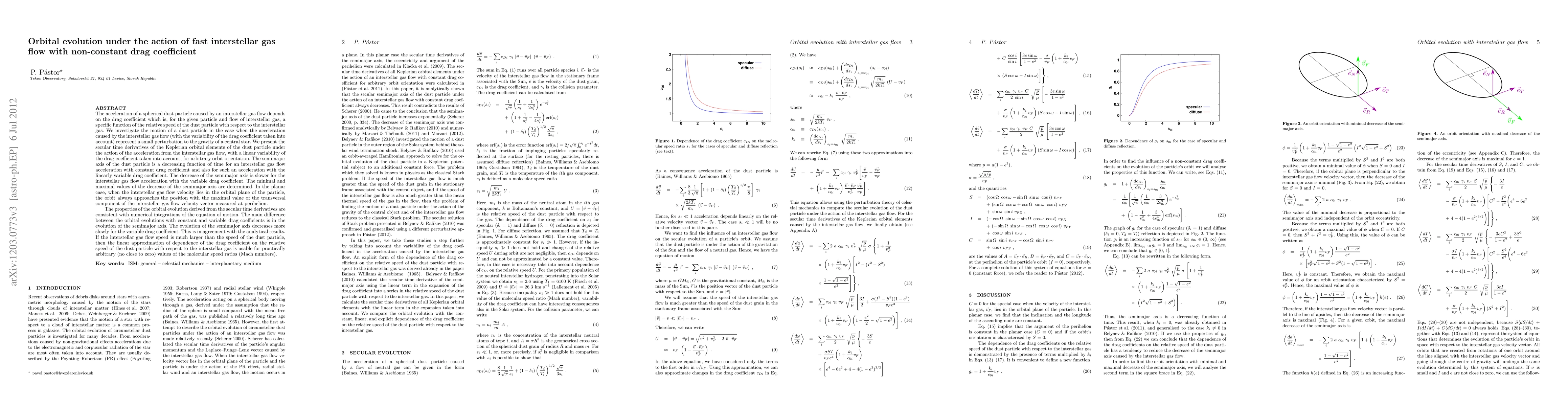 This paper investigates the orbital evolution of a spherical dust particle under the influence of a fast interstellar gas flow with a non-constant drag coefficient. It finds that the semimajor axis decreases over time, with a slower rate for variable drag coefficients, and confirms these results through both analytical derivations and numerical simulations.