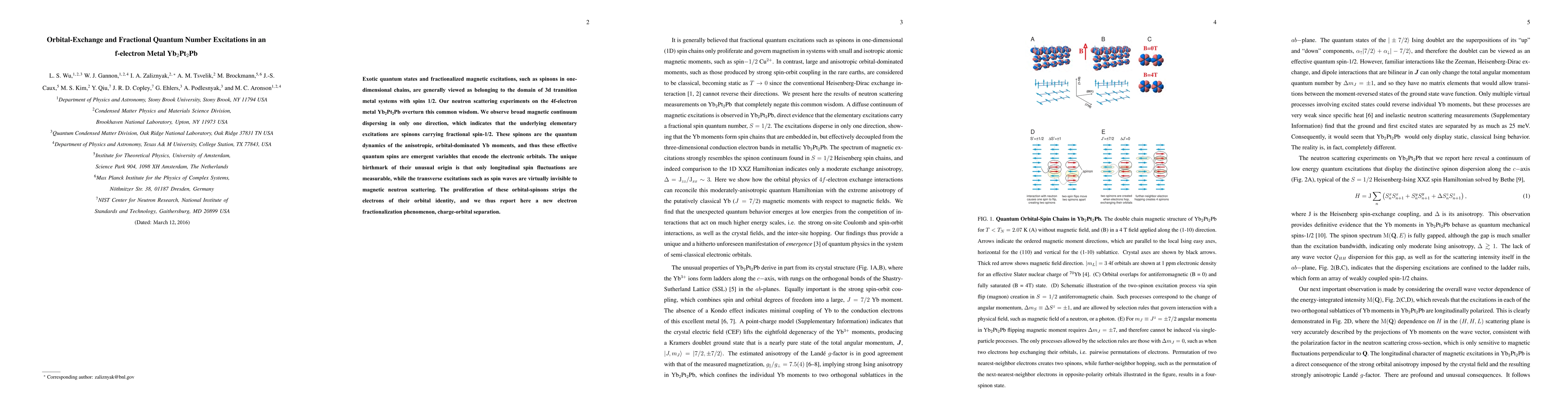 This paper reports on neutron scattering experiments revealing exotic quantum states in the f-electron metal Yb$_2$Pt$_2$Pb, showing spinons with fractional spin-1/2 that emerge from the orbital dynamics of Yb moments, leading to a phenomenon of charge-orbital separation. Only longitudinal spin fluctuations are observed, indicating the absence of traditional spin waves.