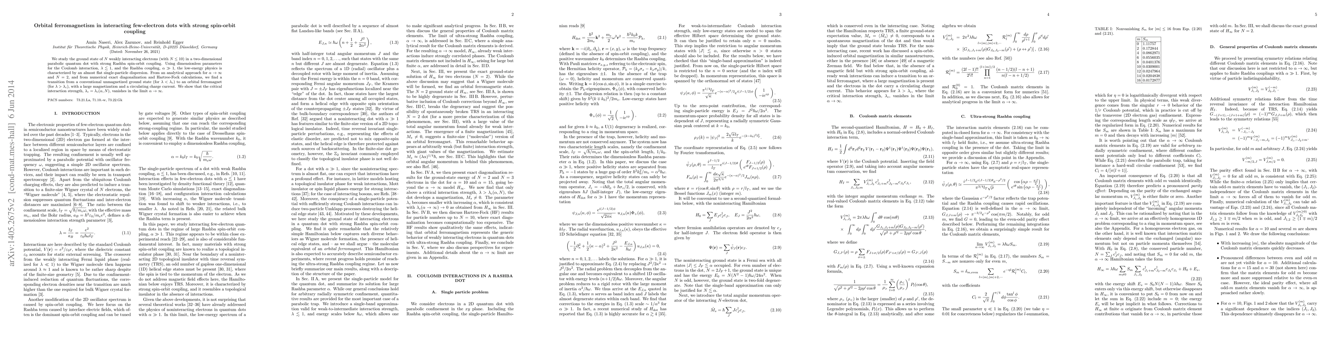 We study the ground state of $N$ weakly interacting electrons (with $N\le 10$) in a two-dimensional parabolic quantum dot with strong Rashba spin-orbit coupling. Using dimensionless parameters for the Coulomb interaction, $\lambda\lesssim 1$, and the Rashba coupling, $\alpha\gg 1$, the low-energy physics is characterized by an almost flat single-particle dispersion. From an analytical approach for $\alpha\to \infty$ and $N=2$, and from numerical exact diagonalization and Hartree-Fock calculations, we find a transition from a conventional unmagnetized ground state (for $\lambda<\lambda_c$) to an orbital ferromagnet (for $\lambda>\lambda_c$), with a large magnetization and a circulating charge current. We show that the critical interaction strength, $\lambda_c=\lambda_c(\alpha,N)$, vanishes in the limit $\alpha\to \infty$.
