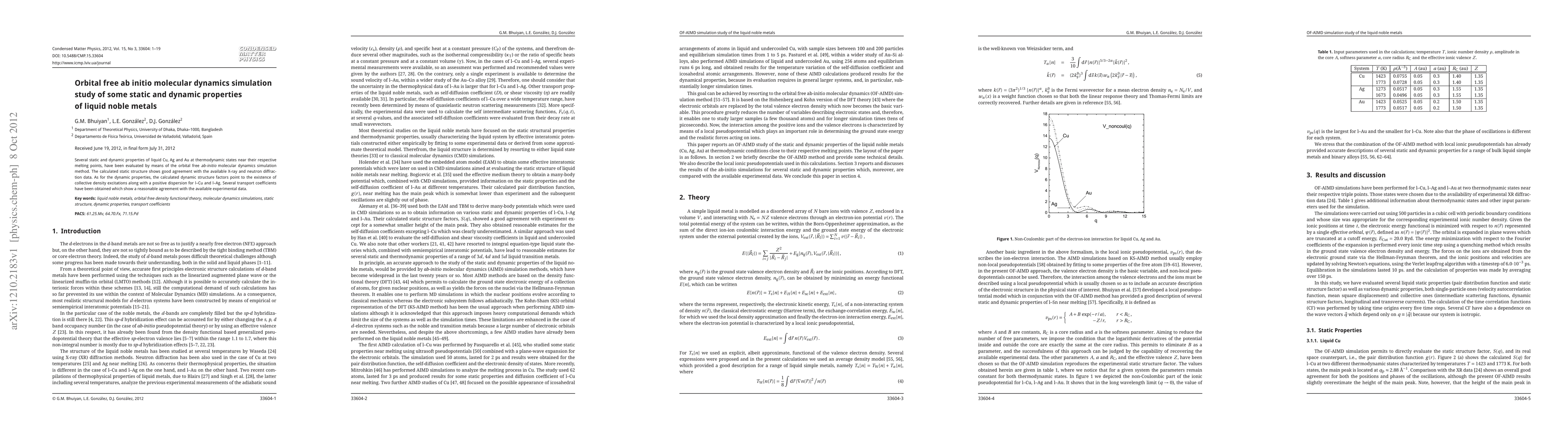 Several static and dynamic properties of liquid Cu, Ag and Au at thermodynamic states near their respective melting points, have been evaluated by means of the orbital free ab-initio molecular dynamics simulation method. The calculated static structure shows good agreement with the available X-ray and neutron diffraction data. As for the dynamic properties, the calculated dynamic structure factors point to the existence of collective density excitations along with a positive dispersion for l-Cu and l-Ag. Several transport coefficients have been obtained which show a reasonable agreement with the available experimental data.