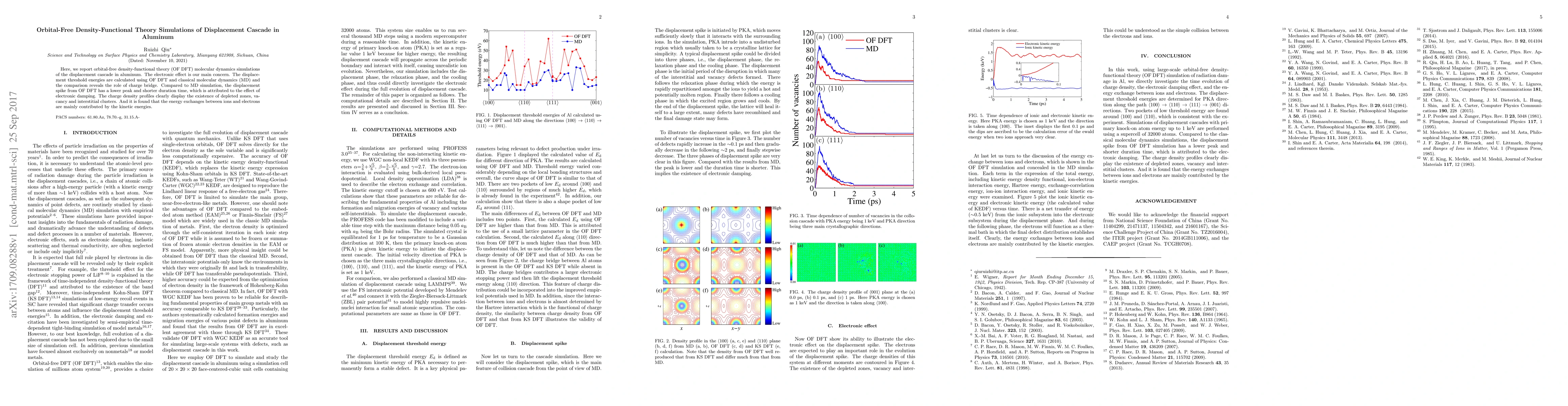 This study uses orbital-free density-functional theory (OF DFT) to simulate displacement cascades in aluminum, focusing on electronic effects. The results show that OF DFT simulations exhibit lower displacement spike peaks and shorter durations compared to classical molecular dynamics, attributing this to electronic damping, and highlight the role of charge bridges in energy exchanges.