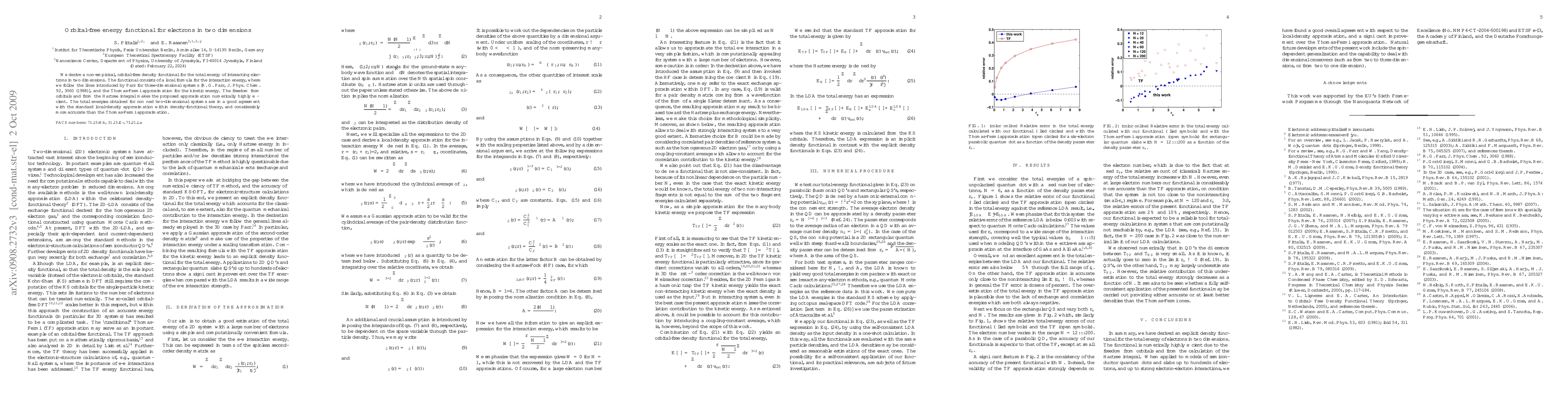 This paper presents a non-empirical, orbital-free density functional for the total energy of electrons in two dimensions, combining a local interaction energy formula and the Thomas-Fermi approximation for kinetic energy. The method shows good agreement with standard local-density approximation and outperforms the Thomas-Fermi approximation in accuracy.