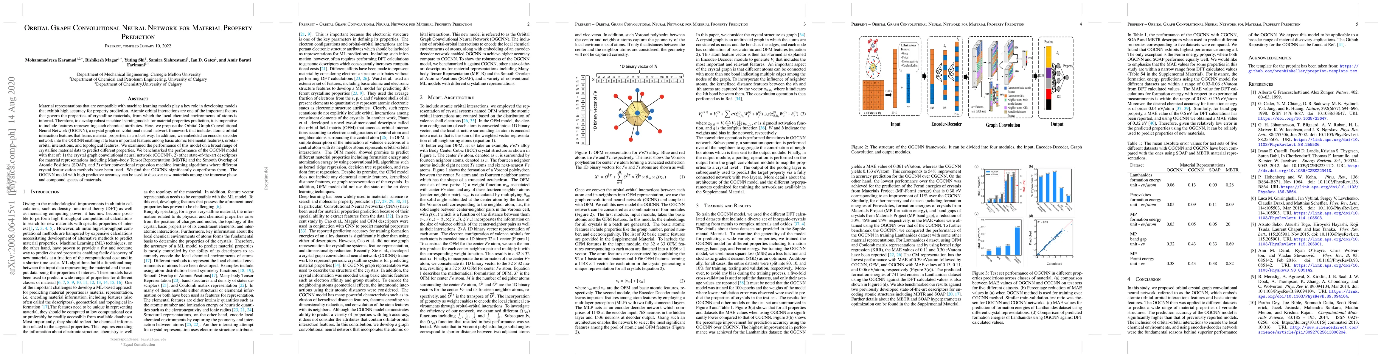 The Orbital Graph Convolutional Neural Network (OGCNN) incorporates atomic orbital interaction features to predict material properties more accurately than existing models. Benchmarked against CGCNN, MBTR, SOAP, and conventional machine learning algorithms, OGCNN demonstrates superior performance, enabling the discovery of new materials.