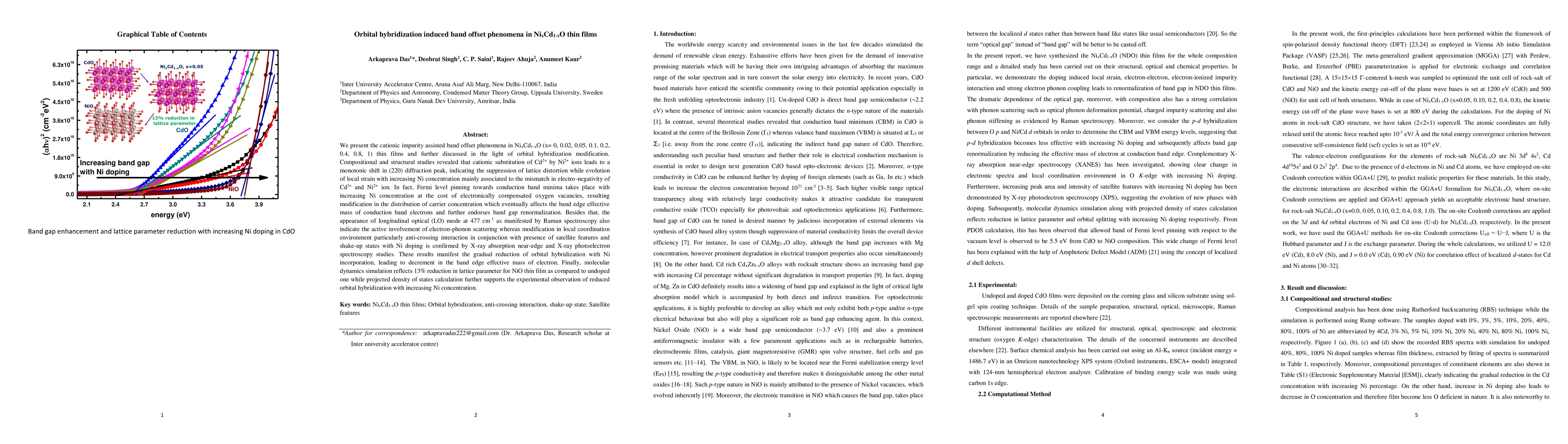 We present the cationic impurity assisted band offset phenomena in NixCd1-xO (x= 0, 0.02, 0.05, 0.1, 0.2, 0.4, 0.8, 1) thin films and further discussed in the light of orbital hybridization modification. Compositional and structural studies revealed that cationic substitution of Cd2+ by Ni2+ ions leads to a monotonic shift in (220) diffraction peak, indicating the suppression of lattice distortion while evolution of local strain with increasing Ni concentration mainly associated to the mismatch in electro-negativity of Cd2+ and Ni2+ ion. In fact, Fermi level pinning towards conduction band minima takes place with increasing Ni concentration at the cost of electronically compensated oxygen vacancies, resulting modification in the distribution of carrier concentration which eventually affects the band edge effective mass of conduction band electrons and further endorses band gap renormalization. Besides that, the appearance of longitudinal optical (LO) mode at 477 cm-1 as manifested by Raman spectroscopy also indicate the active involvement of electron-phonon scattering whereas modification in local coordination environment particularly anti-crossing interaction in conjunction with presence of satellite features and shake-up states with Ni doping is confirmed by X-ray absorption near-edge and X-ray photoelectron spectroscopy studies. These results manifest the gradual reduction of orbital hybridization with Ni incorporation, leading to decrement in the band edge effective mass of electron. Finally, molecular dynamics simulation reflects 13% reduction in lattice parameter for NiO thin film as compared to undoped one while projected density of states calculation further supports the experimental observation of reduced orbital hybridization with increasing Ni concentration.