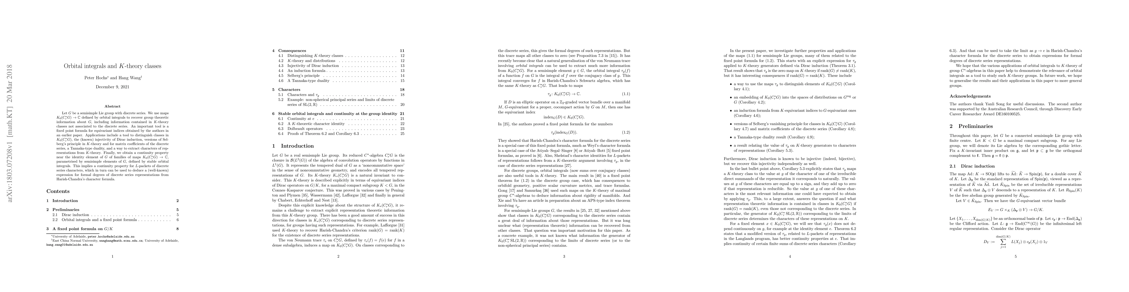 Let $G$ be a semisimple Lie group with discrete series. We use maps $K_0(C^*_rG)\to \mathbb{C}$ defined by orbital integrals to recover group theoretic information about $G$, including information contained in $K$-theory classes not associated to the discrete series. An important tool is a fixed point formula for equivariant indices obtained by the authors in an earlier paper. Applications include a tool to distinguish classes in $K_0(C^*_rG)$, the (known) injectivity of Dirac induction, versions of Selberg's principle in $K$-theory and for matrix coefficients of the discrete series, a Tannaka-type duality, and a way to extract characters of representations from $K$-theory. Finally, we obtain a continuity property near the identity element of $G$ of families of maps $K_0(C^*_rG)\to \mathbb{C}$, parametrised by semisimple elements of $G$, defined by stable orbital integrals. This implies a continuity property for $L$-packets of discrete series characters, which in turn can be used to deduce a (well-known) expression for formal degrees of discrete series representations from Harish-Chandra's character formula.