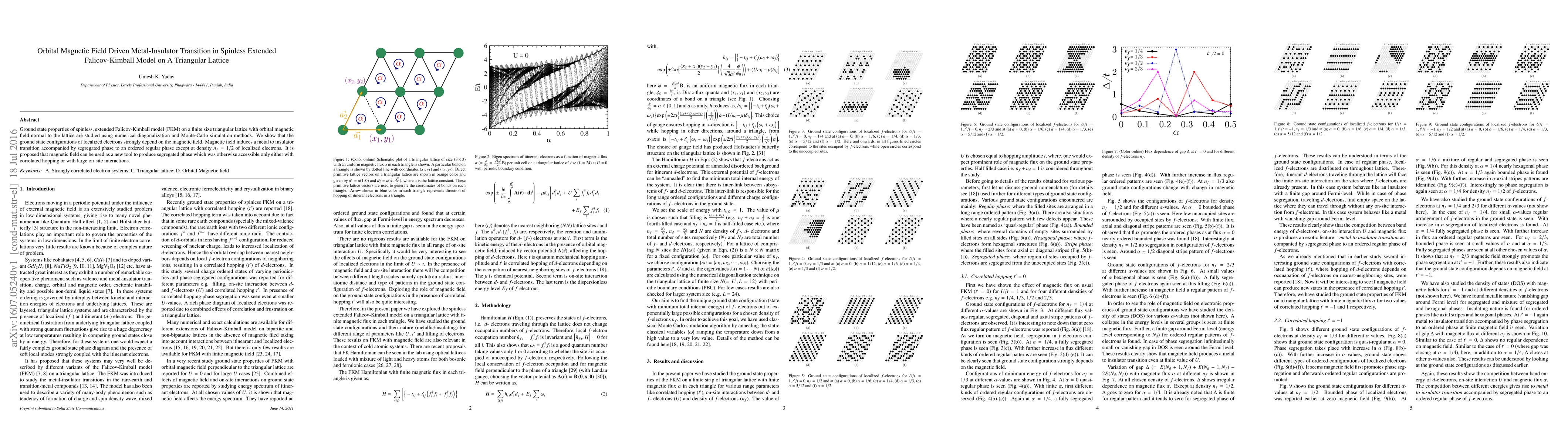 Ground state properties of spinless, extended Falicov-Kimball model (FKM) on a finite size triangular lattice with orbital magnetic field normal to the lattice are studied using numerical diagonalization and Monte-Carlo simulation methods. We show that the ground state configurations of localized electrons strongly depend on the magnetic field. Magnetic field induces a metal to insulator transition accompanied by segregated phase to an ordered regular phase except at density $n_f = 1/2$ of localized electrons. It is proposed that magnetic field can be used as a new tool to produce segregated phase which was otherwise accessible only either with correlated hopping or with large on-site interactions.