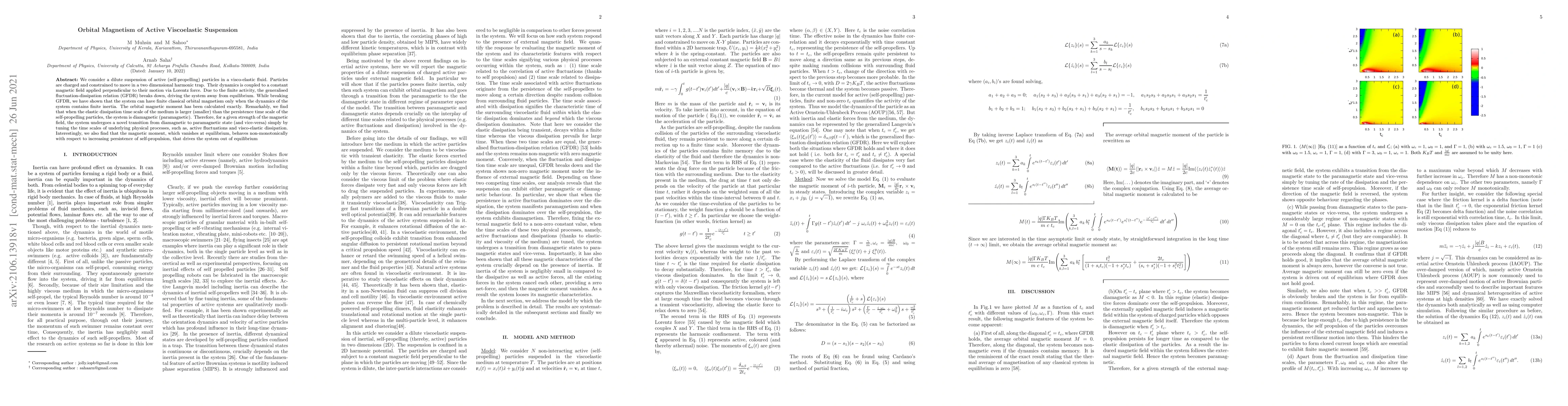 This research examines a suspension of self-propelling charged particles in a visco-elastic fluid under a magnetic field, finding that the system exhibits orbital magnetism when inertia is present. The study reveals a transition from diamagnetic to paramagnetic states by altering time scales of active fluctuations and visco-elastic dissipation, with the magnetic moment showing non-monotonic behavior as self-propulsion increases, driving the system out of equilibrium.