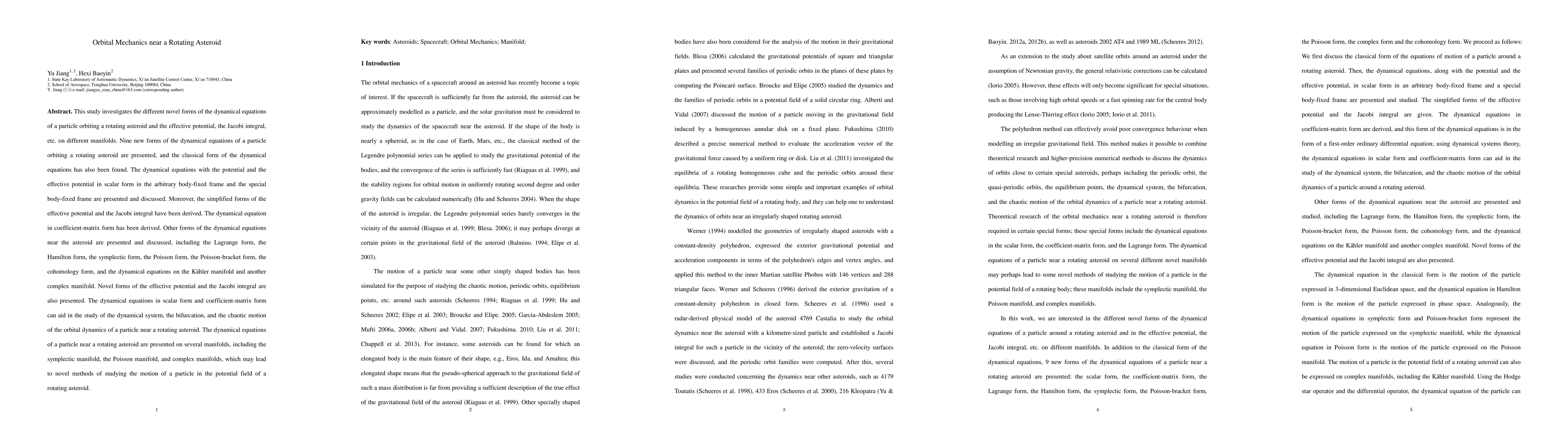 This study investigates the different novel forms of the dynamical equations of a particle orbiting a rotating asteroid and the effective potential, the Jacobi integral, etc. on different manifolds. Nine new forms of the dynamical equations of a particle orbiting a rotating asteroid are presented, and the classical form of the dynamical equations has also been found. The dynamical equations with the potential and the effective potential in scalar form in the arbitrary body-fixed frame and the special body-fixed frame are presented and discussed. Moreover, the simplified forms of the effective potential and the Jacobi integral have been derived. The dynamical equation in coefficient-matrix form has been derived. Other forms of the dynamical equations near the asteroid are presented and discussed, including the Lagrange form, the Hamilton form, the symplectic form, the Poisson form, the Poisson-bracket form, the cohomology form, and the dynamical equations on the K\"ahler manifold and another complex manifold. Novel forms of the effective potential and the Jacobi integral are also presented. The dynamical equations in scalar form and coefficient-matrix form can aid in the study of the dynamical system, the bifurcation, and the chaotic motion of the orbital dynamics of a particle near a rotating asteroid. The dynamical equations of a particle near a rotating asteroid are presented on several manifolds, including the symplectic manifold, the Poisson manifold, and complex manifolds, which may lead to novel methods of studying the motion of a particle in the potential field of a rotating asteroid.
